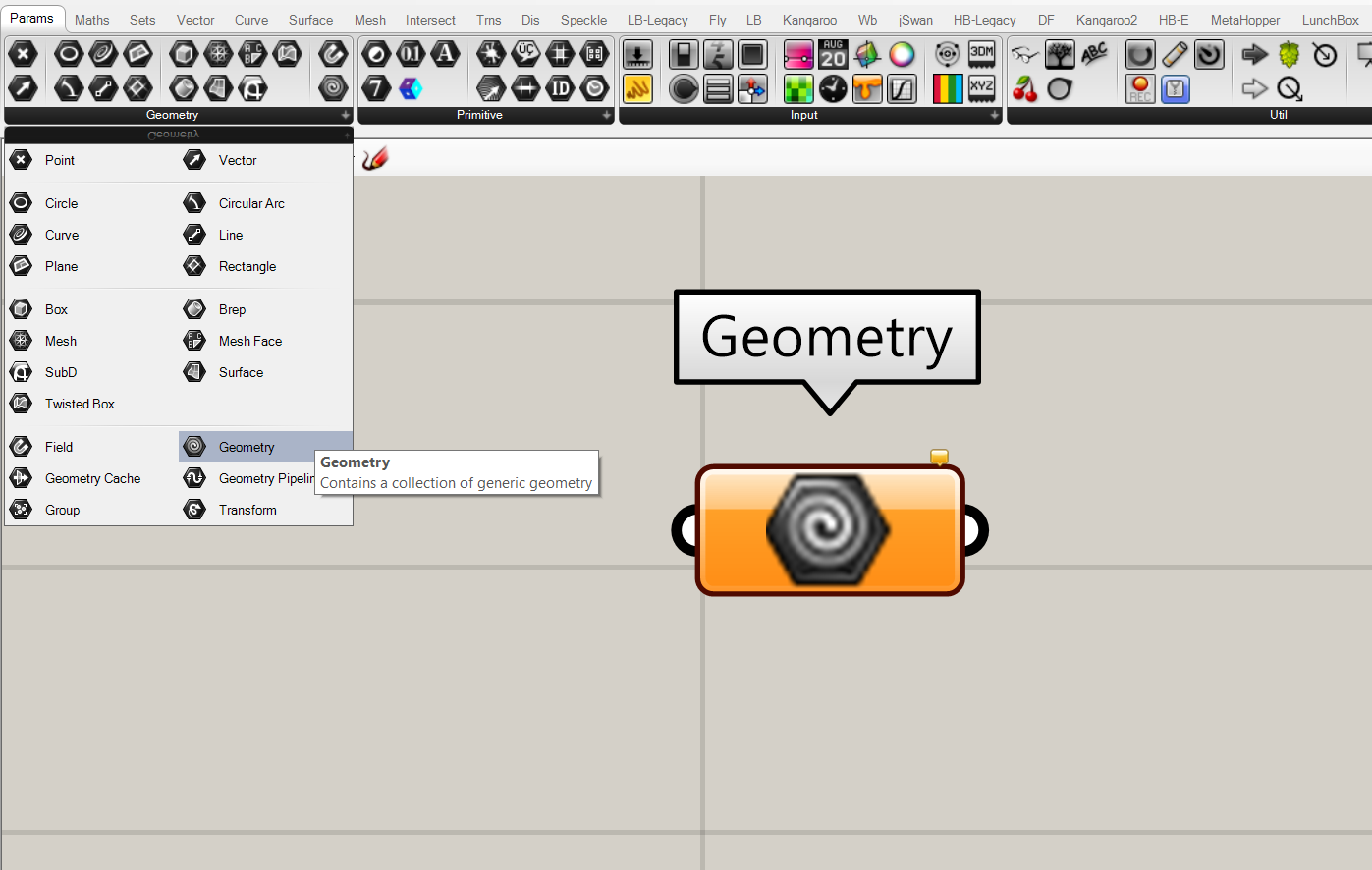 Although we just selected a geometry parameter type, there are several other parameters available. If you would like to move a point for example, it is recommended to use the point parameter. When you are outputting data, you should use the data parameter.