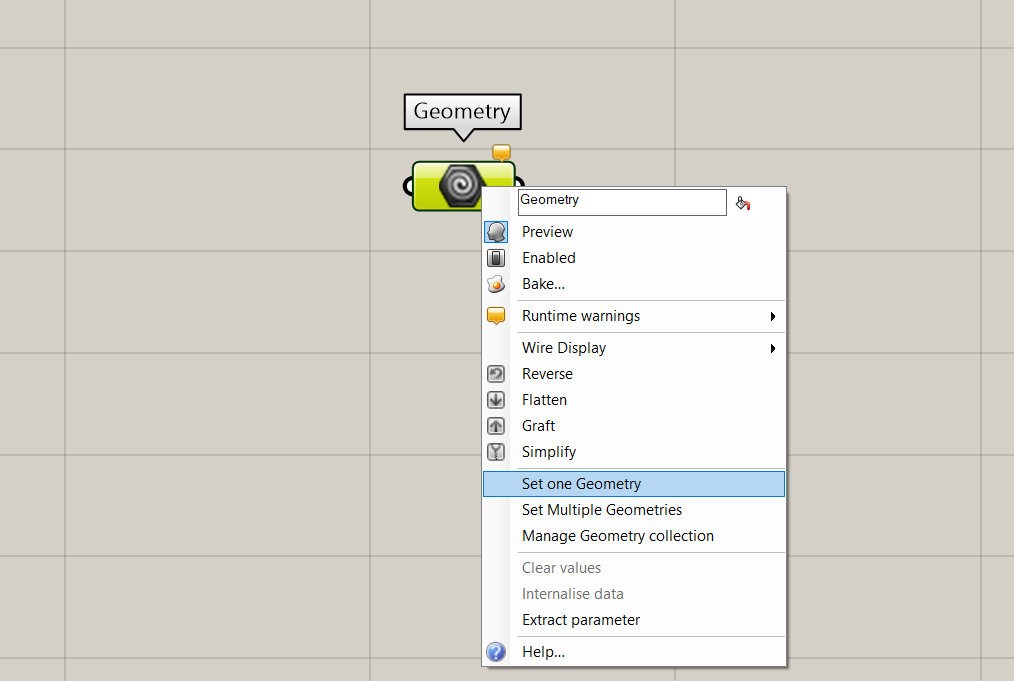 Next, we need to connect our box from Rhino to the geometry parameter in Grasshopper. Right click on the geometry parameter and click on Select one Object. The Rhino viewport will now open. By selecting the box, you will see it is highlighted green or red. This indicates that the geometry is connected to Grasshopper. After connecting the geometry to the Grasshopper parameter, you can hide the Rhino box.