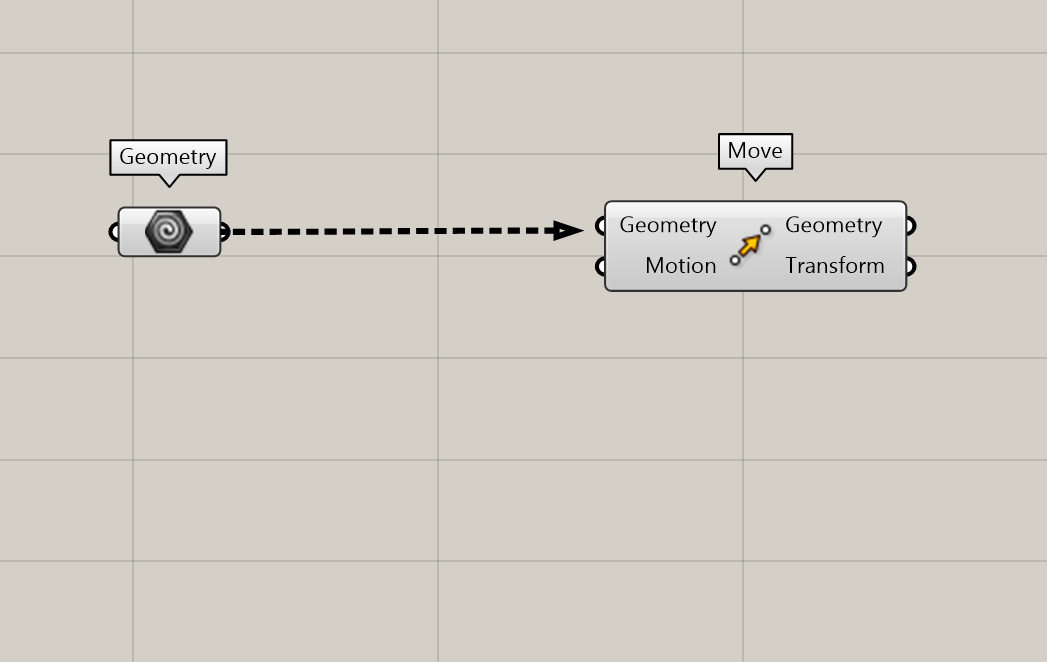 Now we will move the box. Connect a move component to the geometry parameter. First add the move component to the canvas, and then draw a wire between the parameter output and the Geometry input.