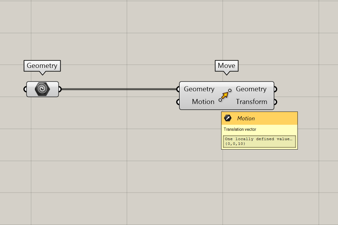 Next to a geometry input, the move component also has a motion input. If we hold our mouse on the motion input, we can see that it requires a translation vector. Currently, the motion is set to {0, 0, 10} which leads to a movement of 10 units in the z-direction.