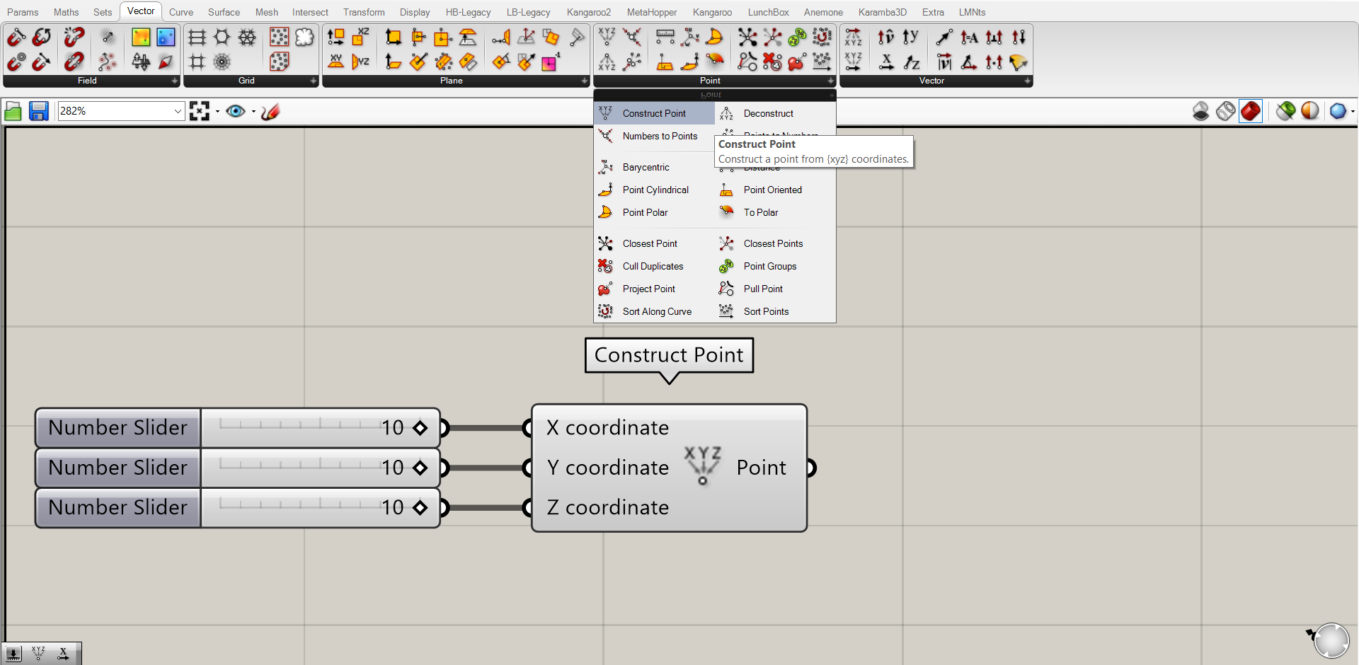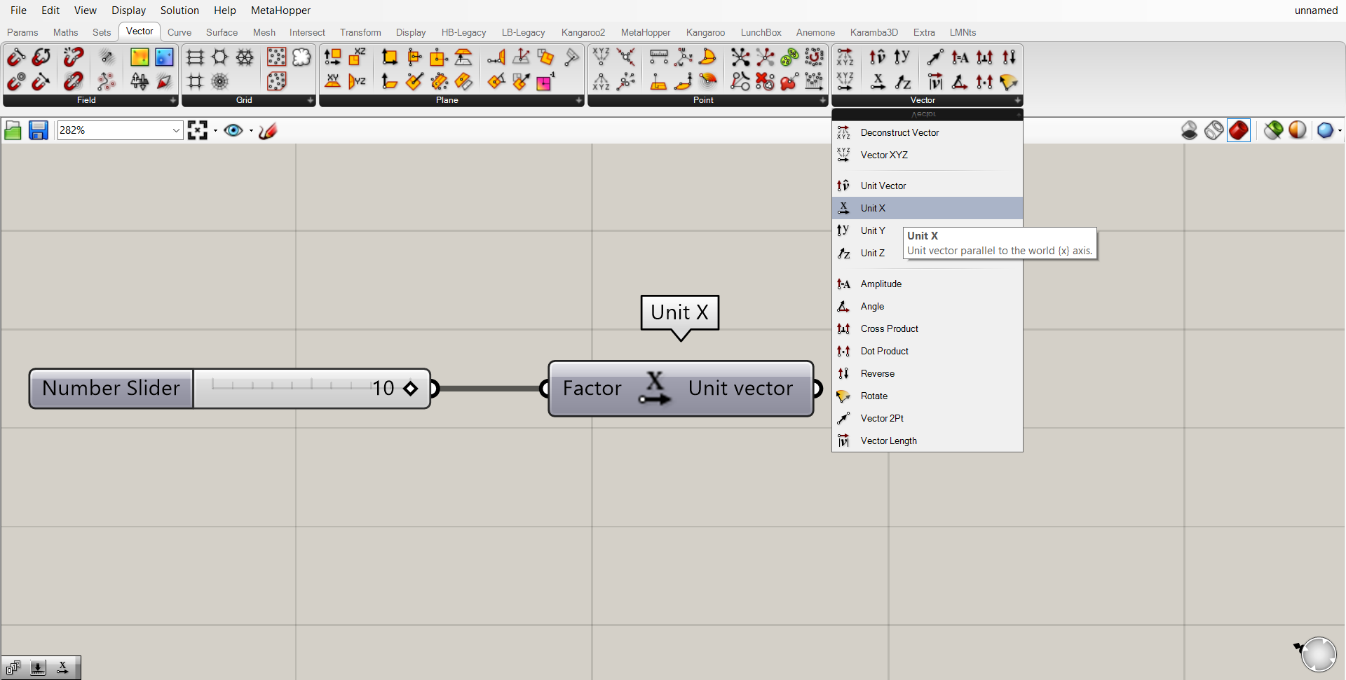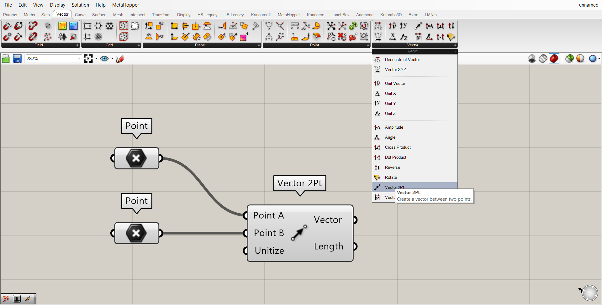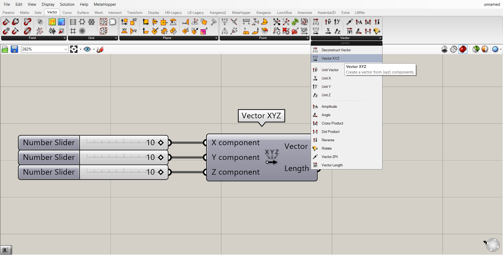 A Vector describes direction and distance. Vectors are widely used in Grasshopper and form often the basis for complex transformations. The vector can be defined in four ways.