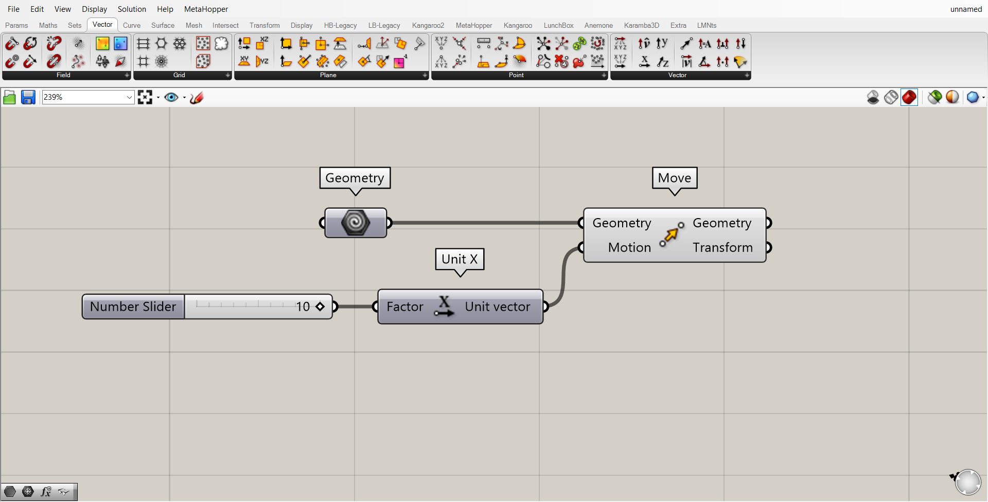 Now you know how to perform one of the most basic operations in grasshopper – moving an object with a specified vector. In following tutorials, you will start seeing how powerful just a couple of additional operations can be.