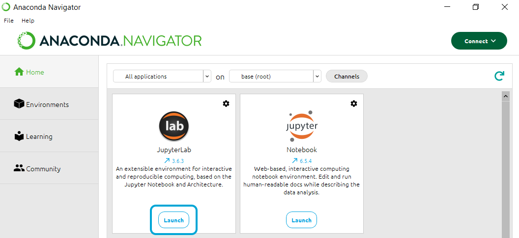 • Launch the Anaconda Navigator and select the “Launch” button under Jupyter Lab