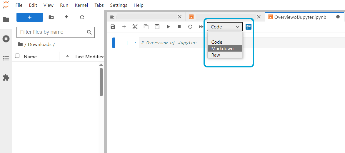 There are different types of cells that can be used in Jupyter. Most commonly used are Code and Markdown. When you create a new cell, it is automatically a Code cell. If you would like to change this, click on the drop-down and select Markdown.