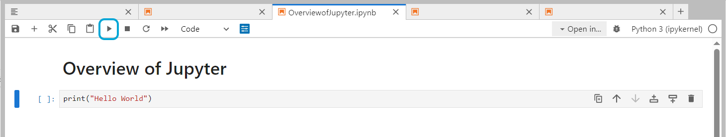 Next, run the cell using either the play button on the ribbon or the keyboard shortcuts for the following: