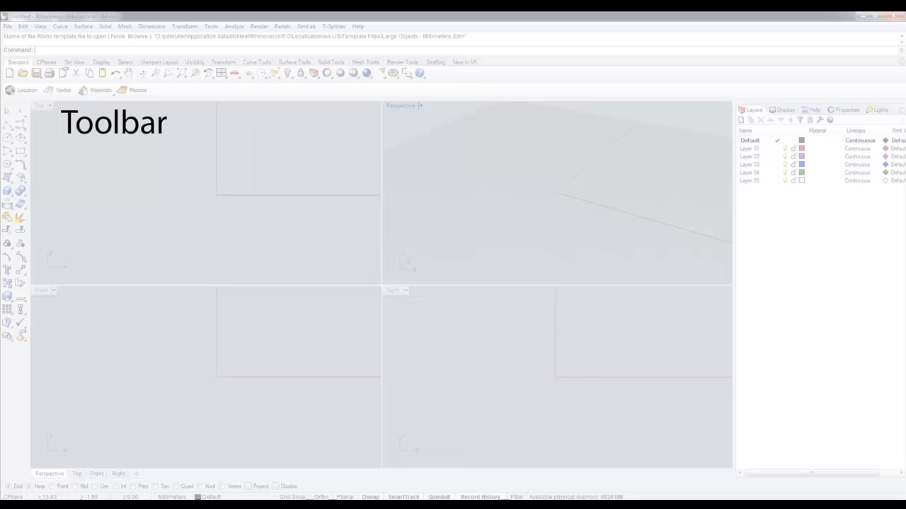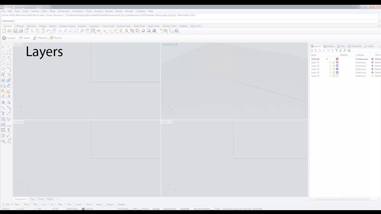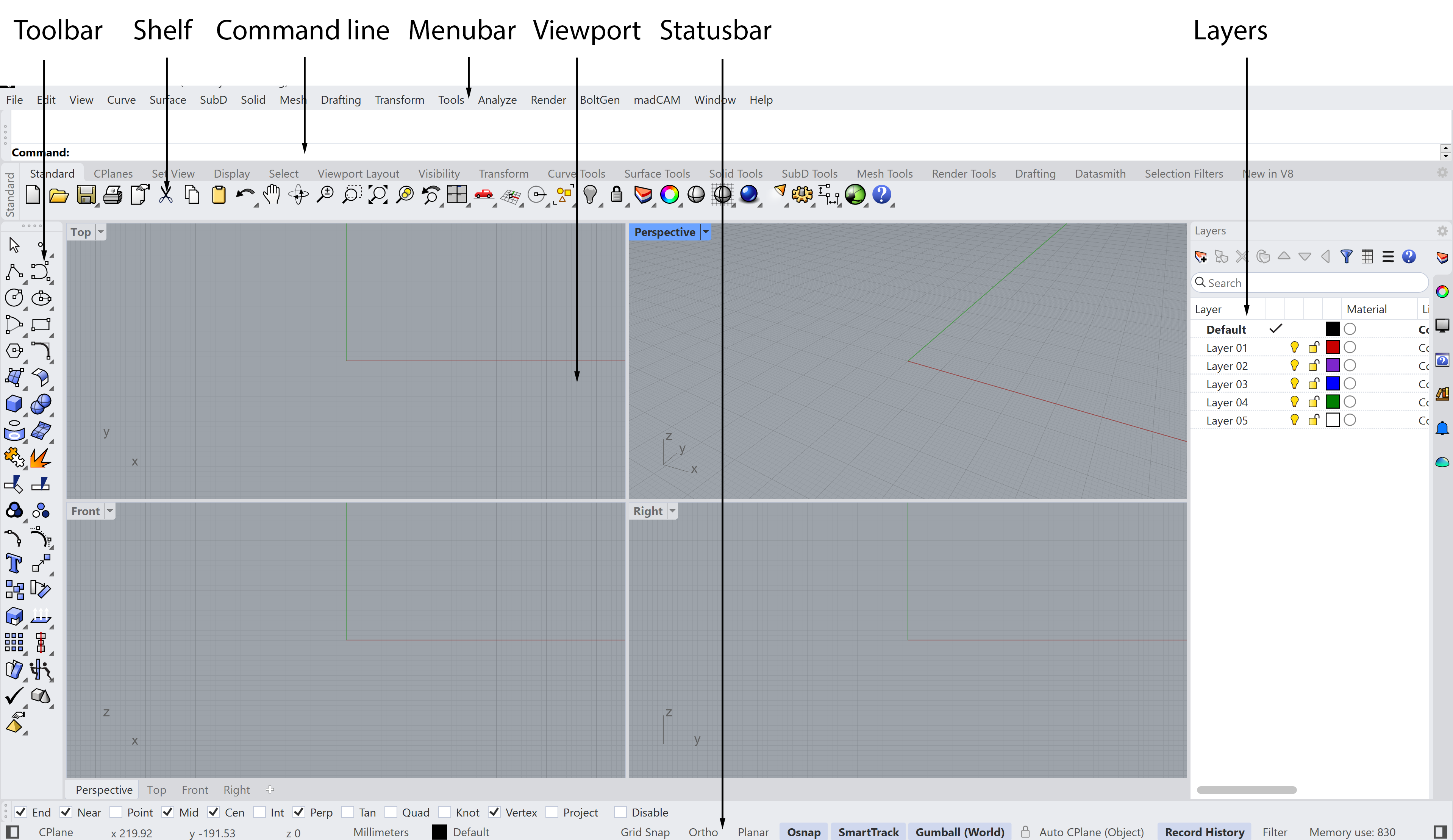 The Rhino graphics area holds the viewports which will display your geometry from various angles. The standard setup for this graphic area is 4 viewports with a perspective view, an orthogonal side, front and top view. Everything you draw will be visible in these viewports; it displays the virtual space.