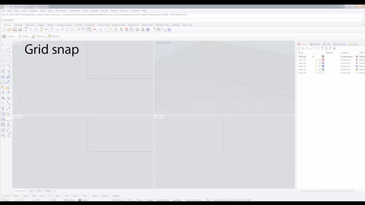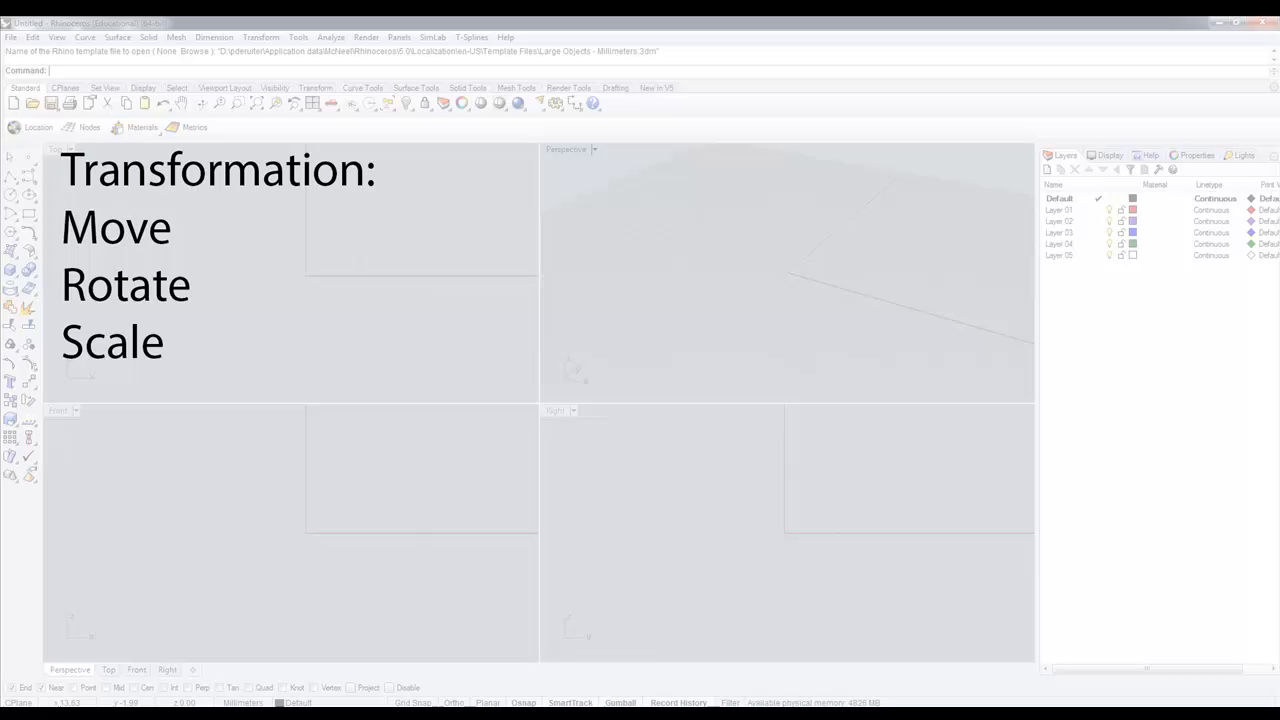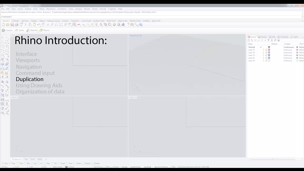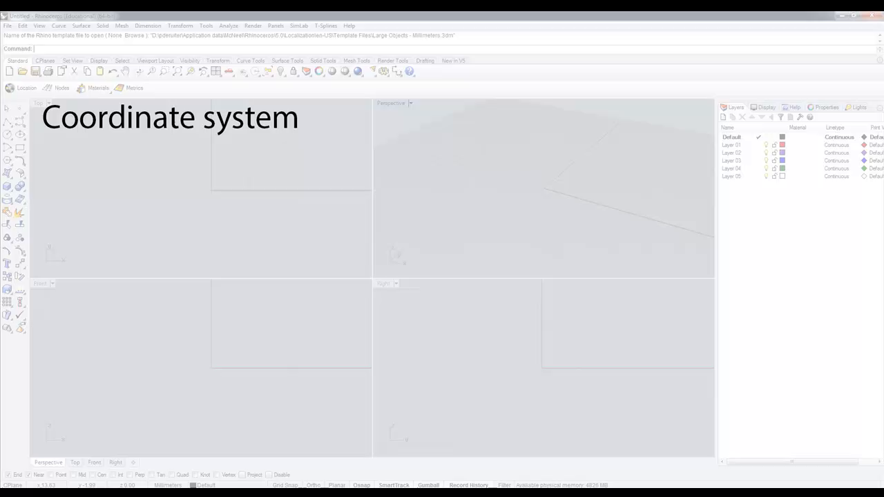 The Rhino graphics area holds the viewports which will display your geometry from various angles. The standard setup for this graphic area is 4 viewports with a perspective view, an orthogonal side, front and top view. Everything you draw will be visible in these viewports; it displays the virtual space.