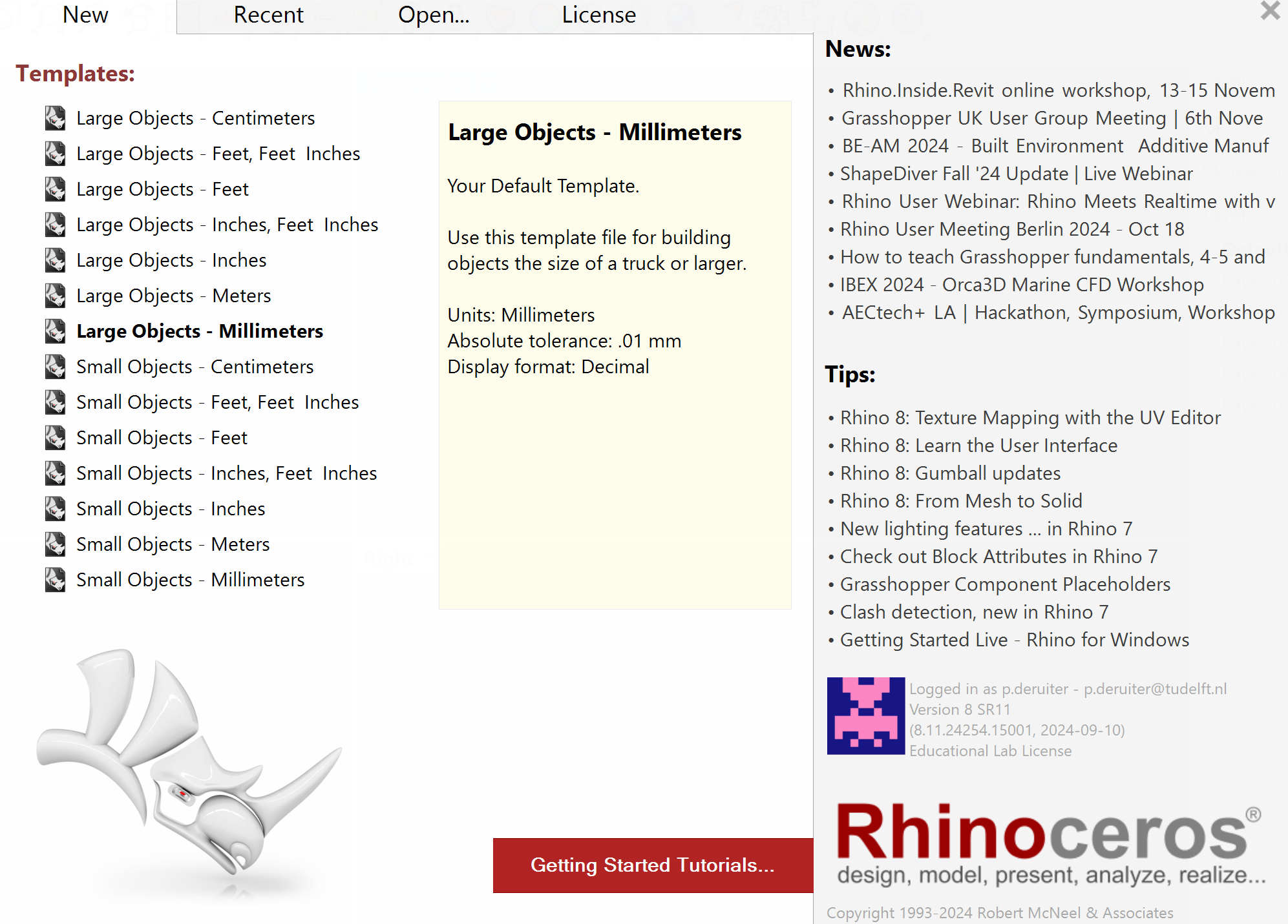 When you start up rhino you will get a menu asking on what scale you want to work. The options are small and large with different units. Small and large are defined by the size of a truck. So when we design a building we will use the Large option, with mm as unit.