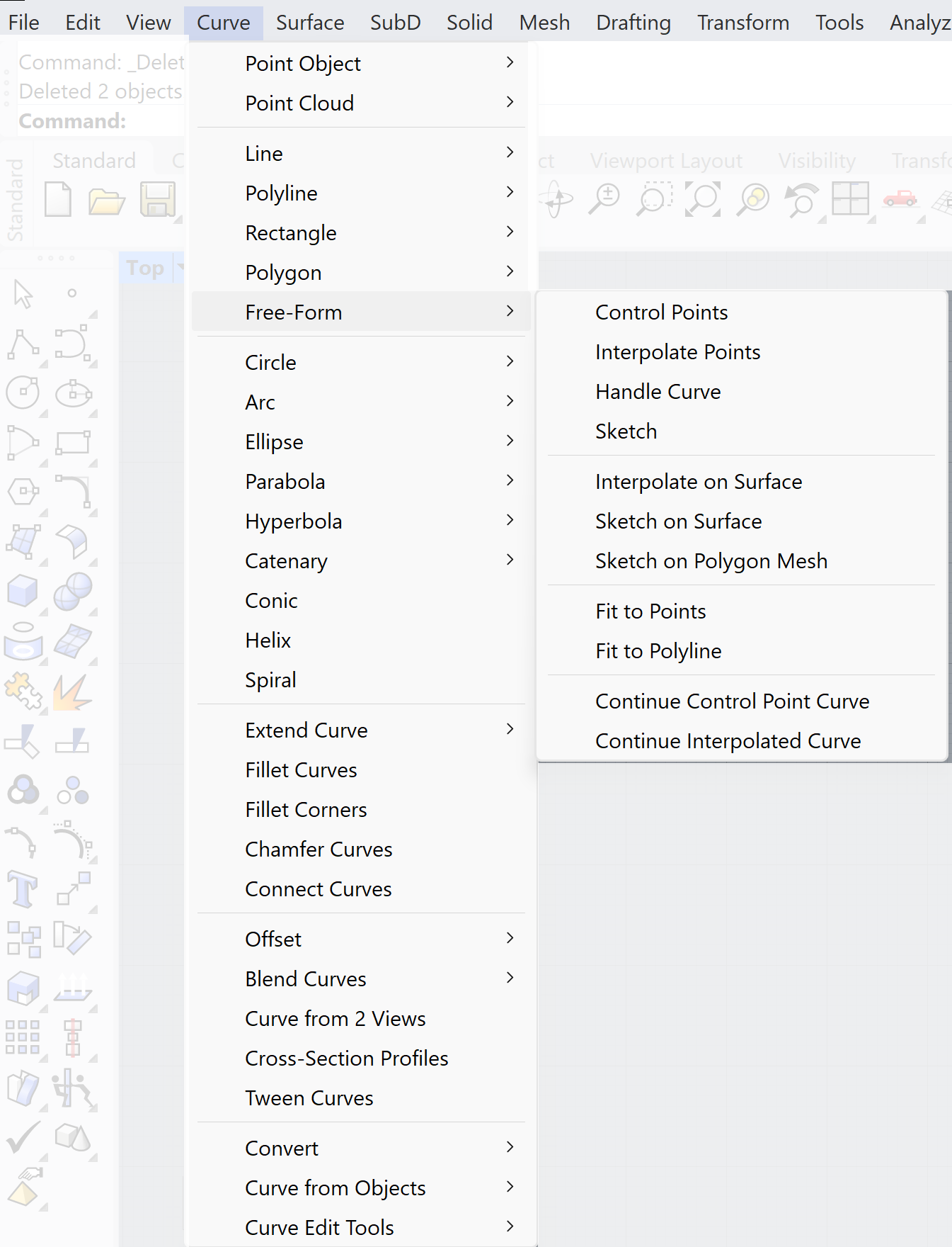The use of the menu bar. The menu bar gives you access to all the pull-down menus which are available in Rhino. The organization of the commands are such in the pull-down menu’s that you work from left to right and from top to bottom. You start with generating a set of curves, then you generate a surface with the help of the curves, these surfaces can be joined into a solid and the solid can be transformed to a mesh. Although this might sound now unfamiliar, you will recognize this setup once you are start using Rhino.