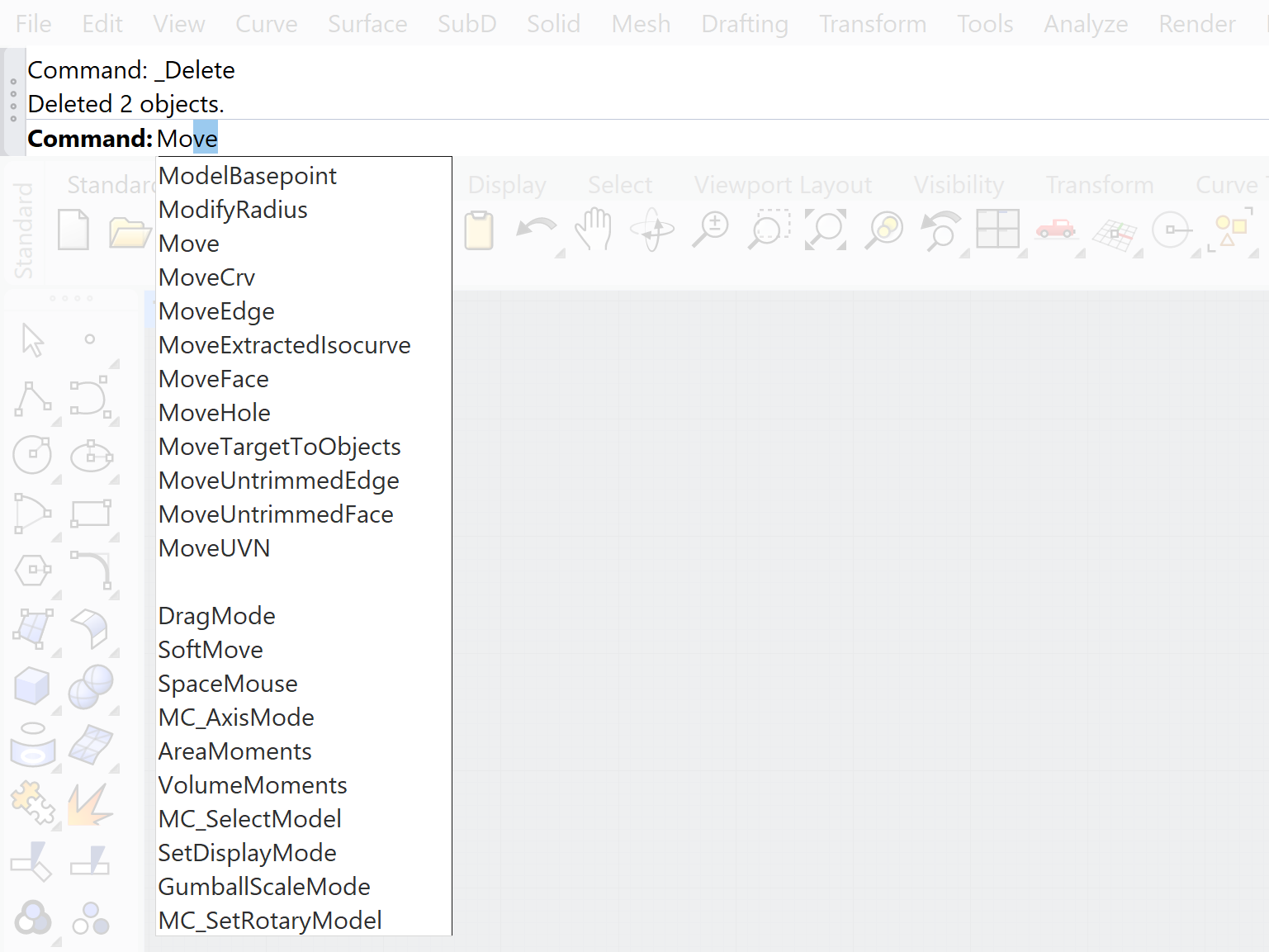 When enough letters of the command are typed so that it is unique, the command name completes on the command line. Press Enter to activate the command once the full command name appears. As you type command names, the autocomplete command list appears. As you type more letters, the list is narrowed down to the possible commands. Left click on the command in the list to start it.