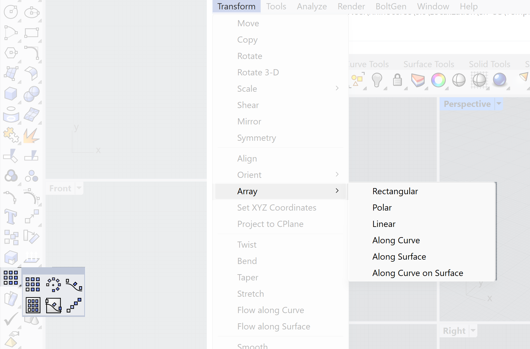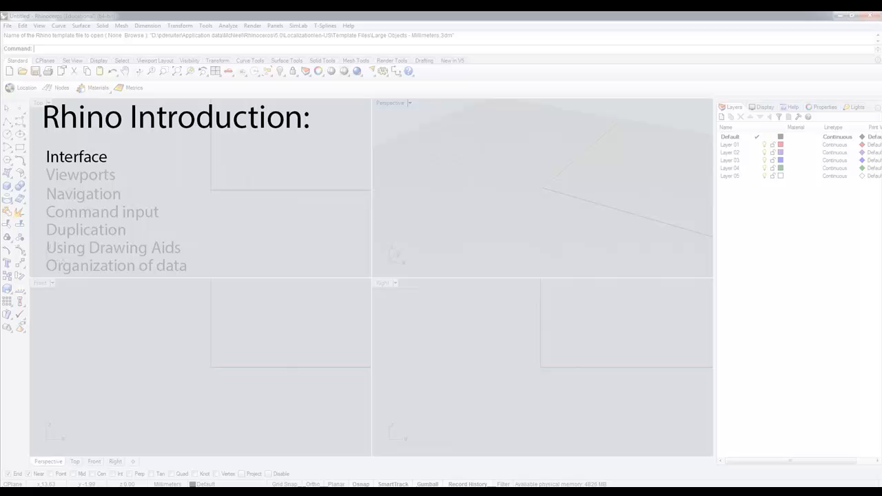 The interface of Rhino is quite straight forward. The interface has similarities with most 2d and 3d programs used at the faculty of Architecture. The drawing options are extensive and support a range of tools which enable the fast generation of complex 3d geometry. Keep in mind that the interface is designed and has a certain logic which is related to the workflow of the program itself.