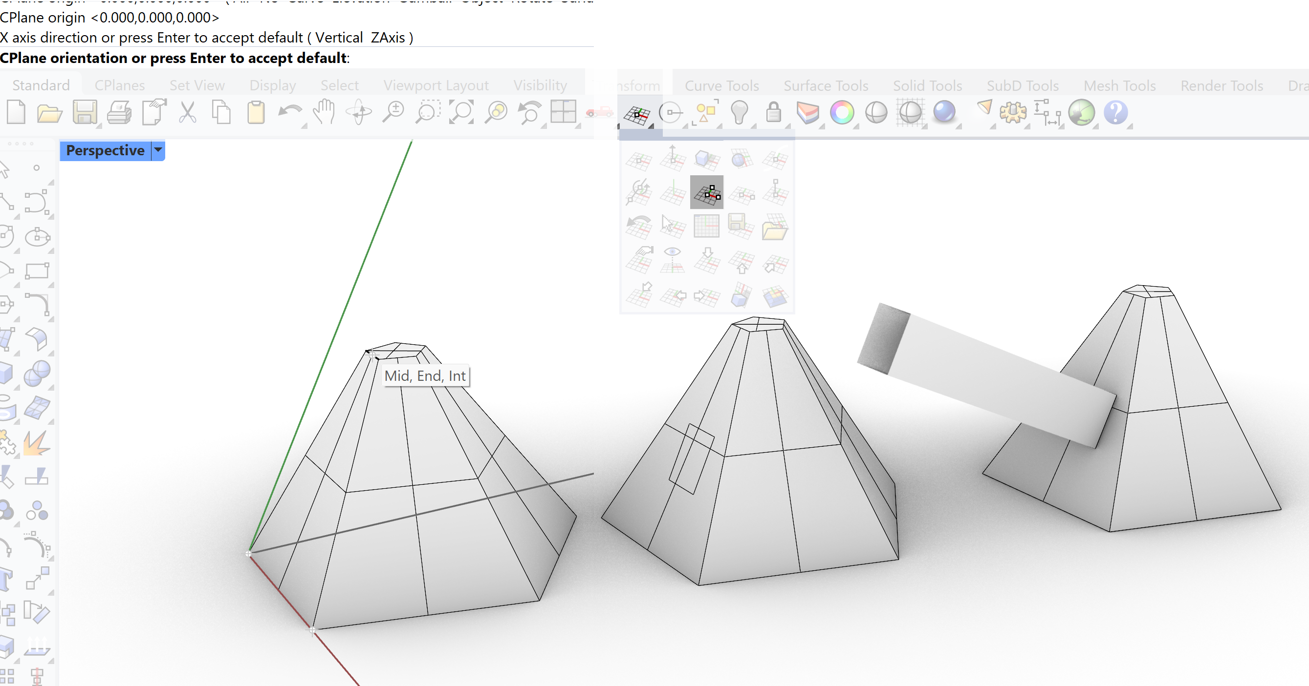When you make geometry it will be placed on the grid which is visible in the viewport. The grid is therefore your construction plane. This can be problematic if you want to generate an object which should not be aligned with or placed on the standard grid. The grid however can be moved and rotated. In the example you see a pyramid structure with sloped sides. If you want to draw a cube aligned to the side and onto the side of the pyramid then you can realign the grid or also called the Construction Plane You can change the orientation of a construction plane at any time. Changing the construction plane can help you constructing geometry at difficult places and orientations.