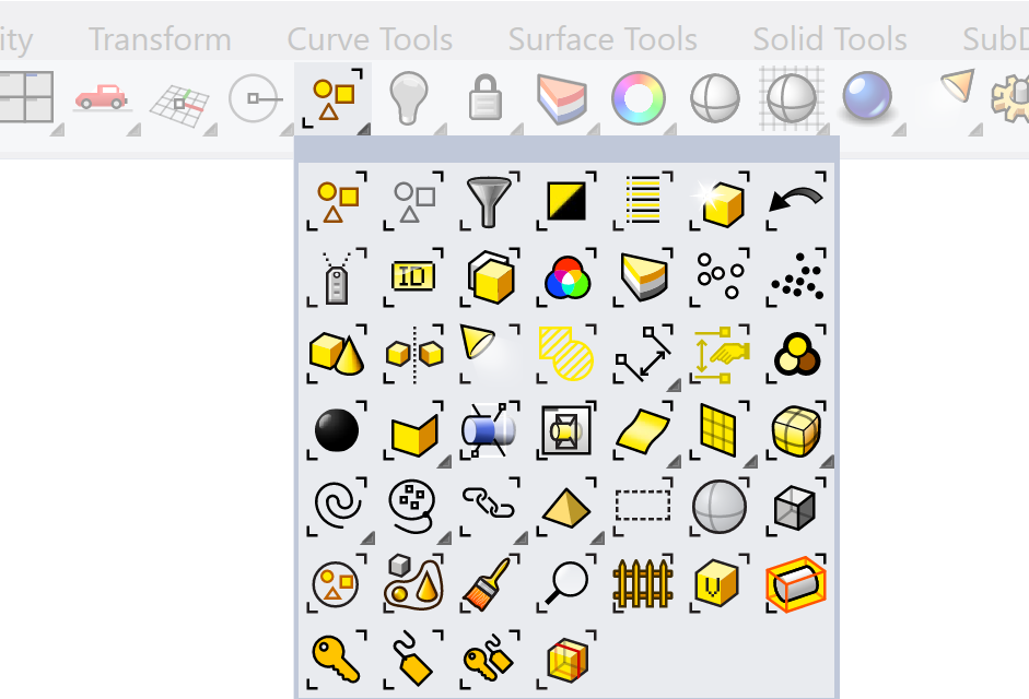 Tooltips tell what each button does. Move your pointer over a button without clicking it. A small yellow tag with the name of the command appears in Rhino, many buttons can execute two commands. The tooltip indicates which buttons have dual functions.