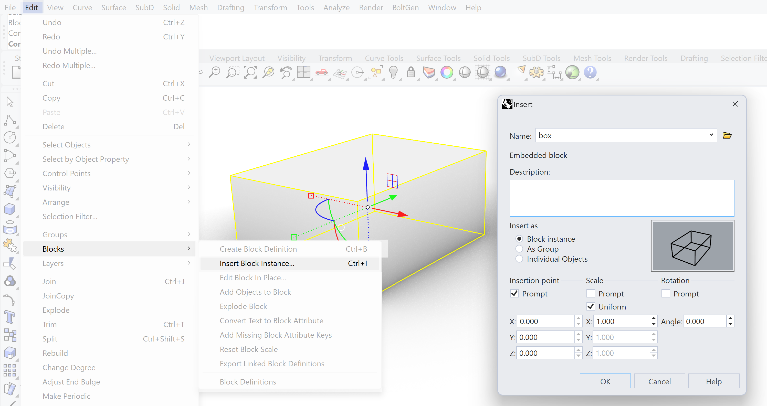 and select the blocks name from the menu. You are asked if you want to be prompted when the block is inserted into your scene. This is for the move option useful because it allows you to place the block just by clicking with your mouse. If you have objects which are always on the same location you could use the option of defining the point of insertion. This can be useful for the drawing frame and block with information about the drawing.