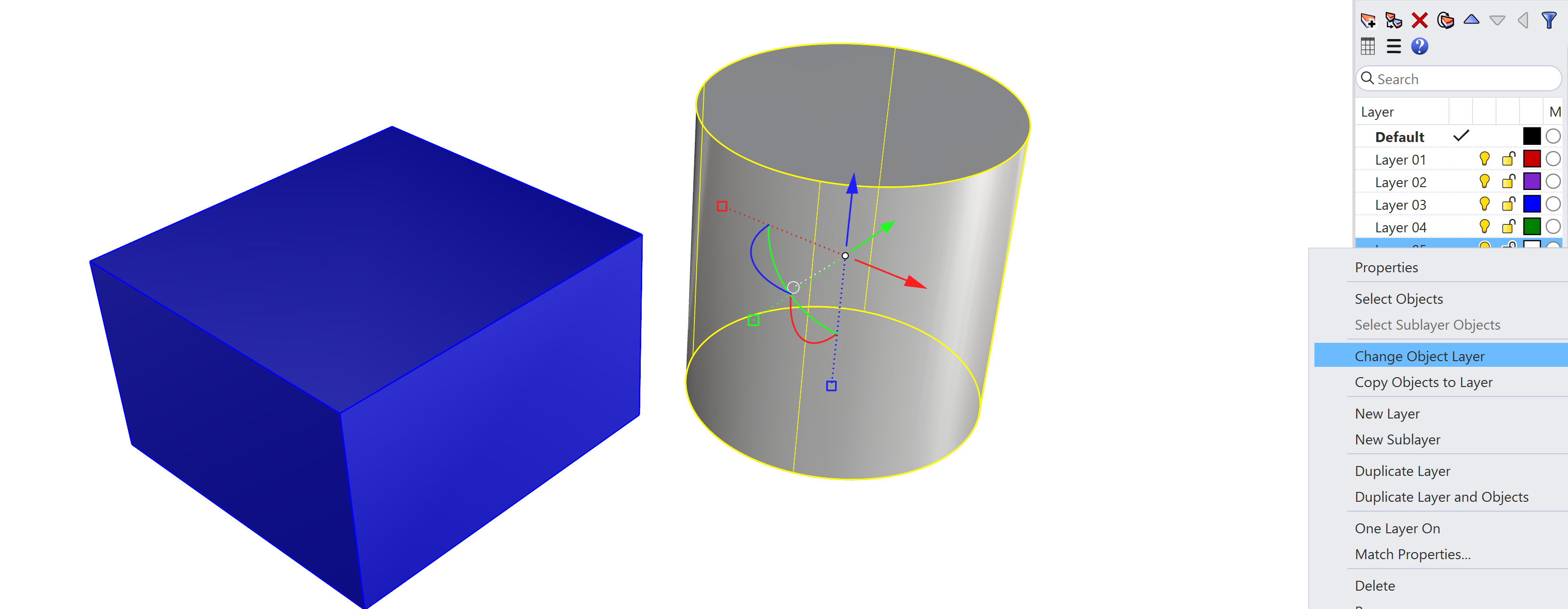 Like in most other 2D/3D design programs, Rhino has the ability to use layers. Layers are overlapping views of your scene that can have objects assigned to them. You can assign any objects within a scene to layers. One useful characteristic of layers is that they let you simplify your scene so you can work on specific objects without disturbing other objects. You can choose which objects of the scene you want to assign to a layer and then selectively make them visible or invisible. A color can be assigned to each layer. This color will be the base color of all the objects in that layer.