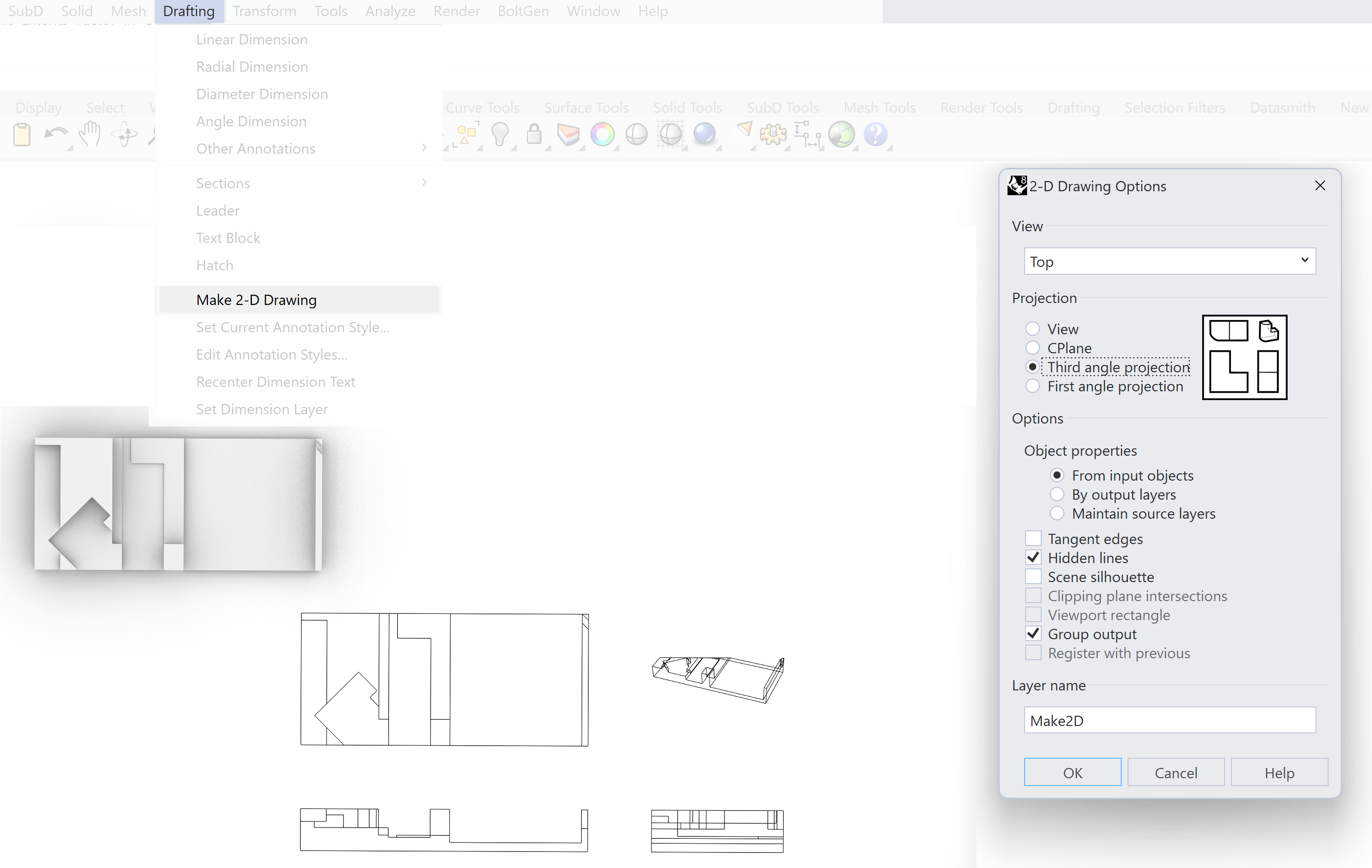 2D drawings are still widely used in communicating your design. Most 3D software have the option of automatically generating these drawings from your 3D design. In Rhino we can use the Make 2D command. Select: