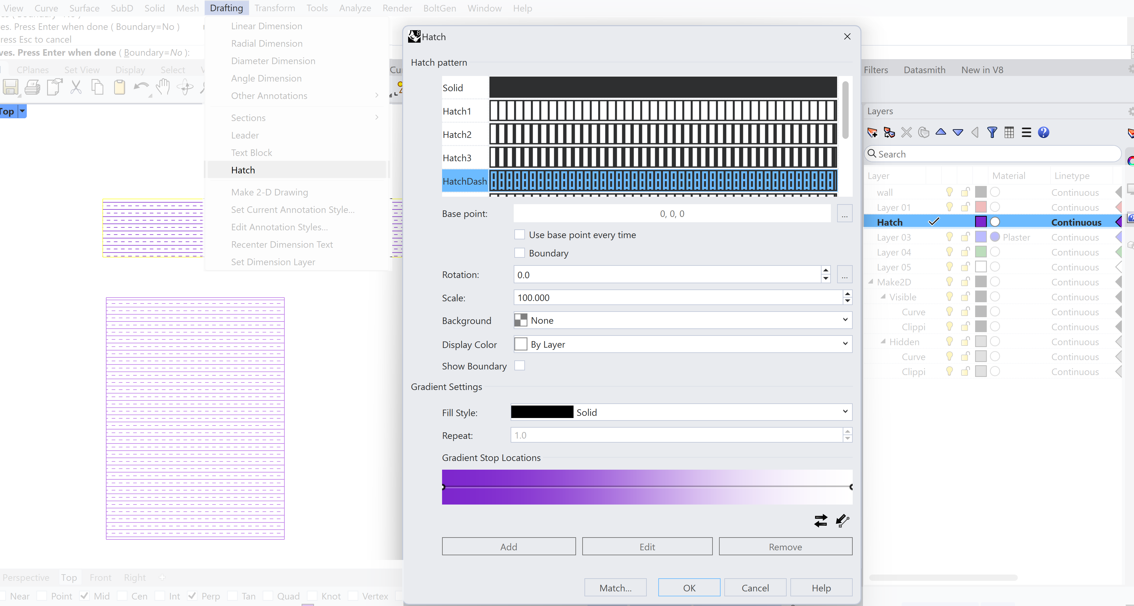 Hatches can be quite useful to define the properties of your geometry. A wall can have another hatch pattern then a floor for example. This technique is widely used in technical drawings where black and white printouts restrict you from using color.