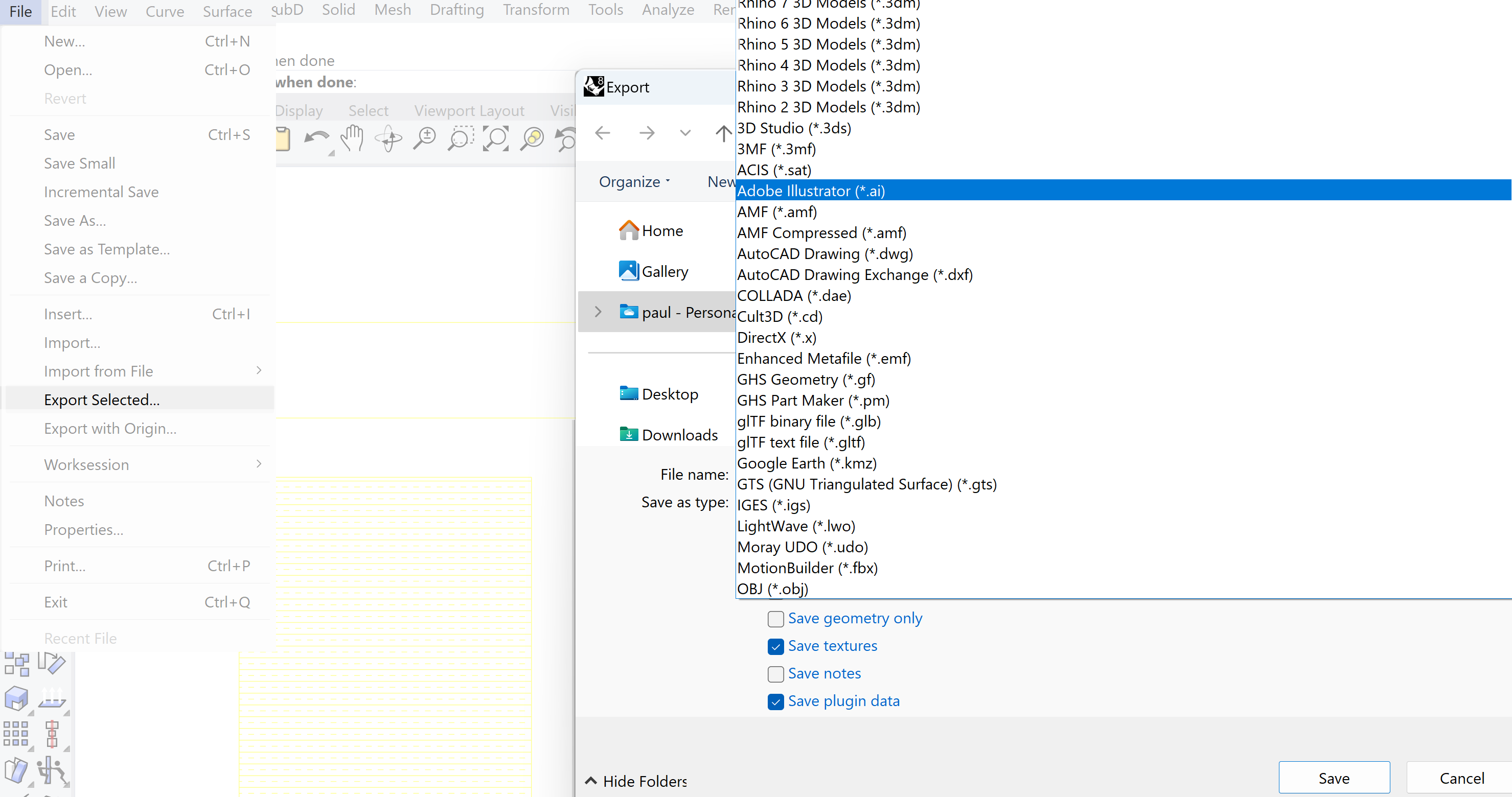 Rhino generates curves which can be saved and imported in Adobe Illustrator. This is very simple. Select the curves and go to:
