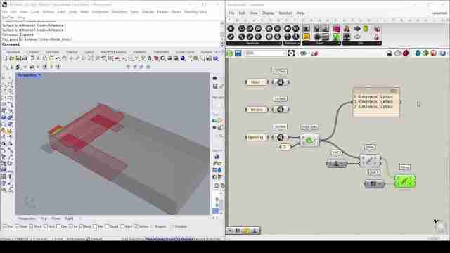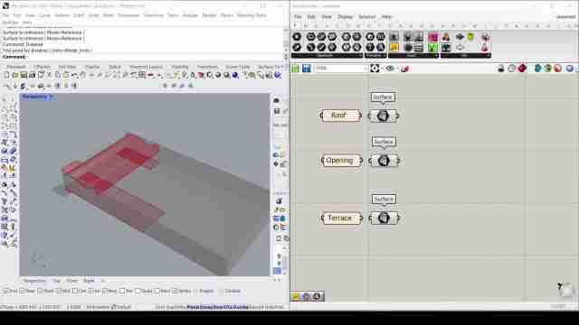 Design the surfaces for: roof (blue), terrace(s) (orange), opening (white) and context walls (grey) and assign each of the three to a separate surface node. The design surface from Rhino can be imported into grasshopper by: