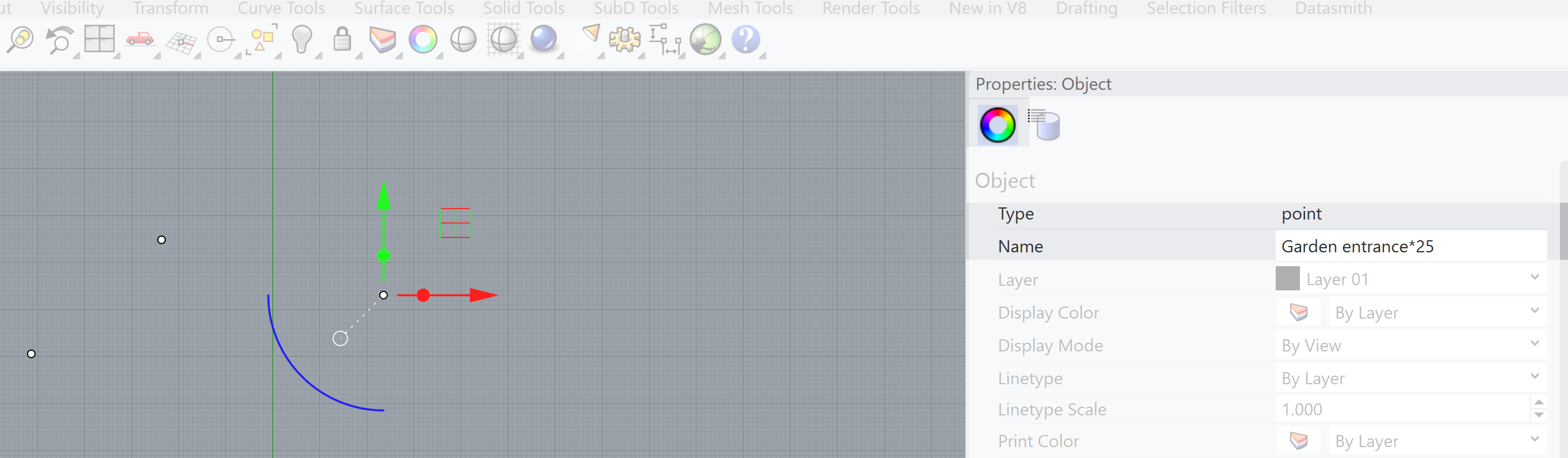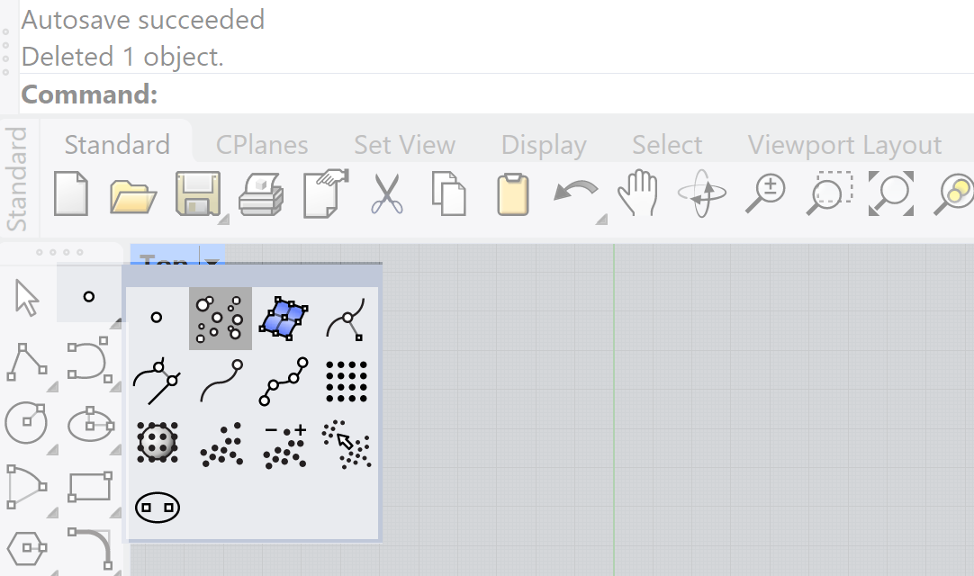 To make a Graph representing the spatial / functional relationships we need the spaces/functions defined. The spaces/functions are defined by points. These have to be created in Rhino not Grasshopper. Each point will in this case represent a function within the sculpture garden.  To create the points use the toolbar and select the points icon. Create the amount of points ( functions) you need for your design. The location of the points are not relevant yet. It is about the connection between the points.