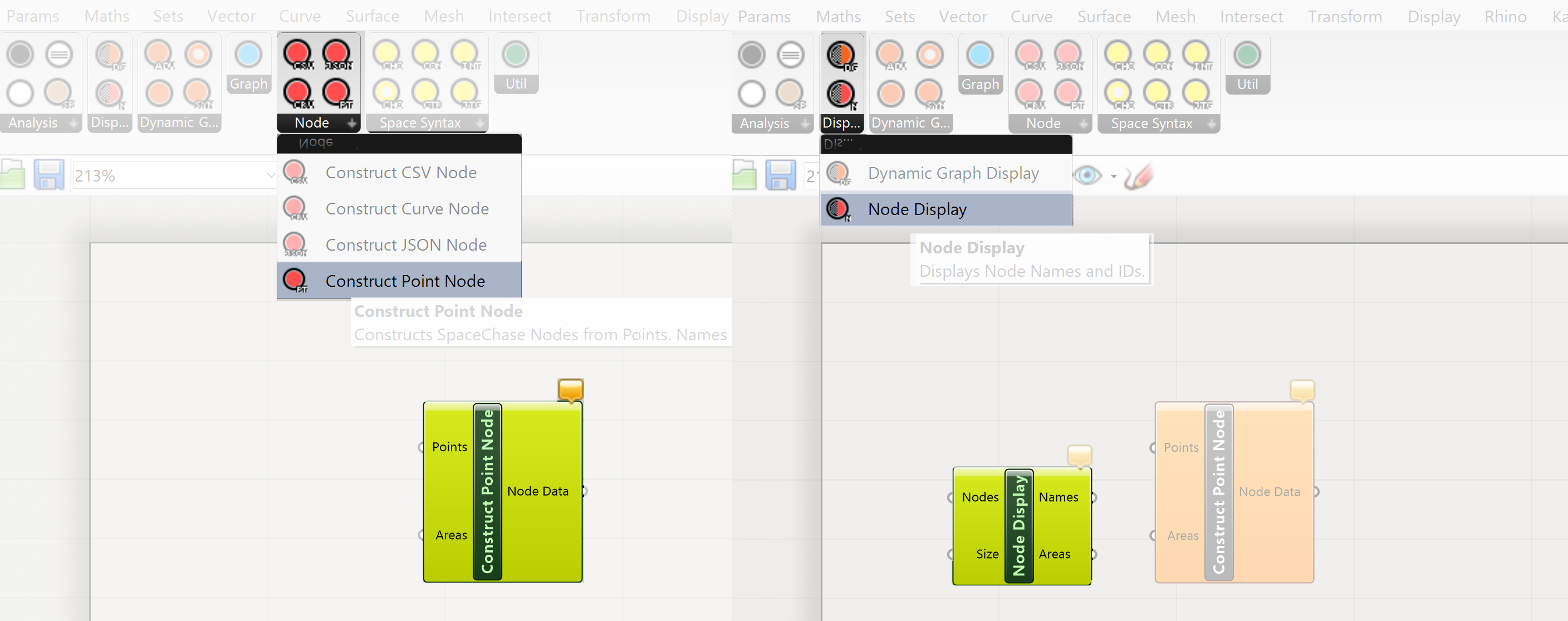 To make the graph with the spaces(functions) and their connections we need a Construct Graph component. This component has two inputs, the nodes (spaces-functions) and the edges (connections between the nodes)