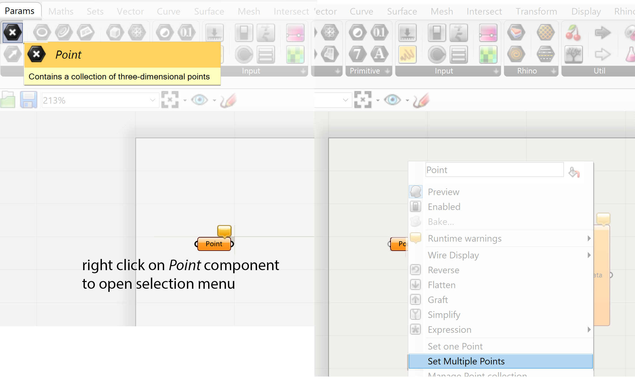 We connect the Rhino points to Grasshopper by using the Parameter tab and select the Point parameter