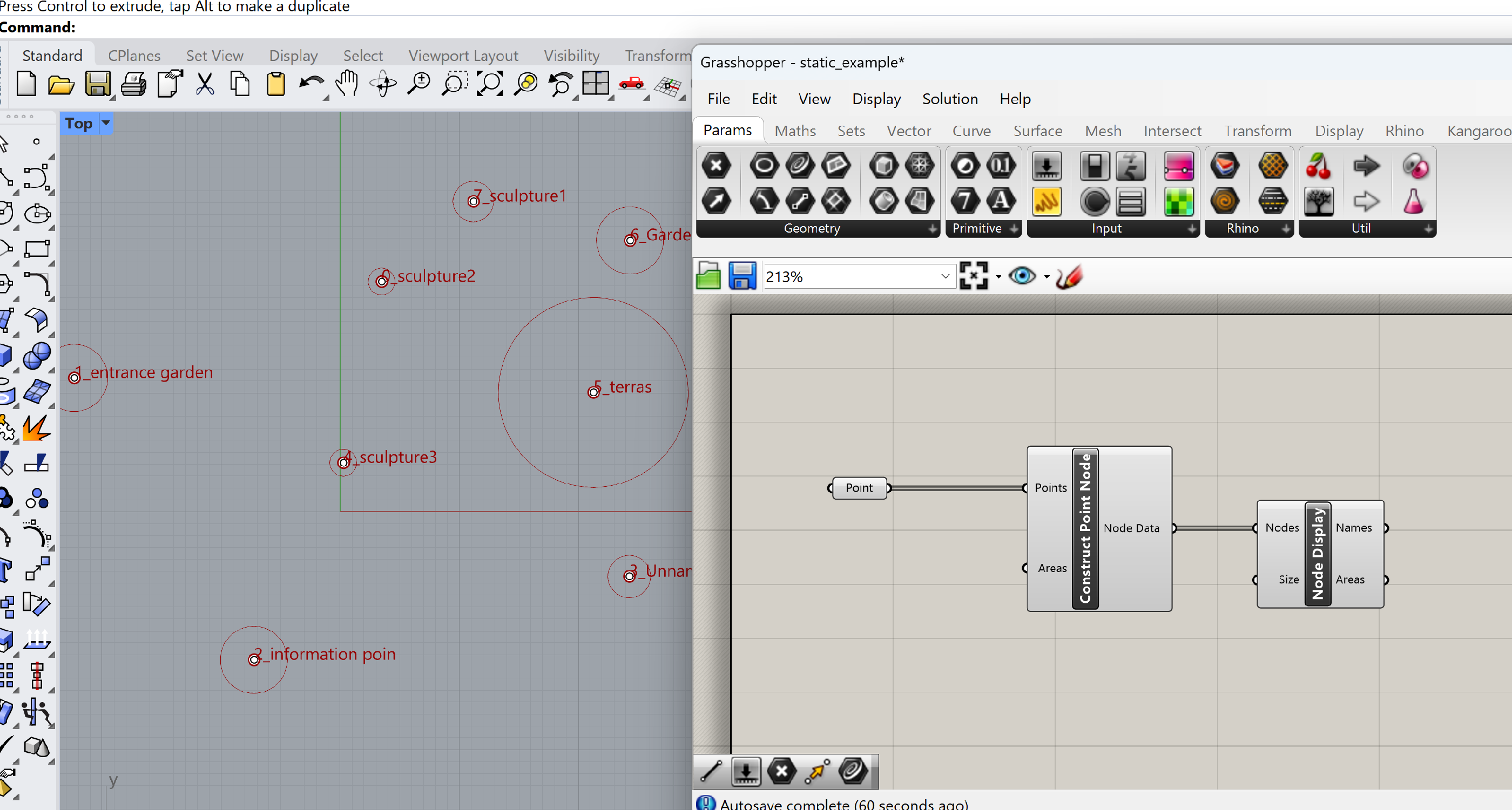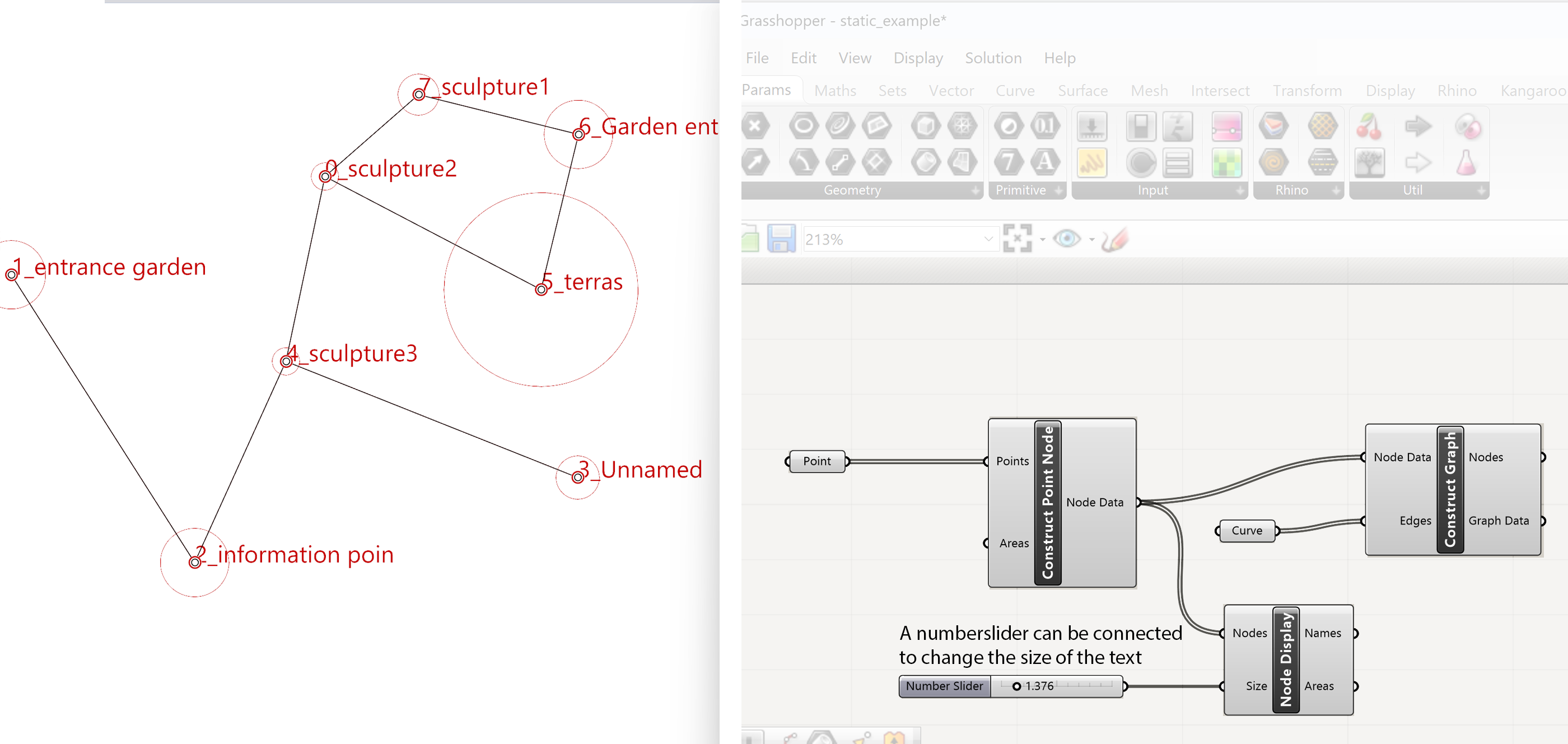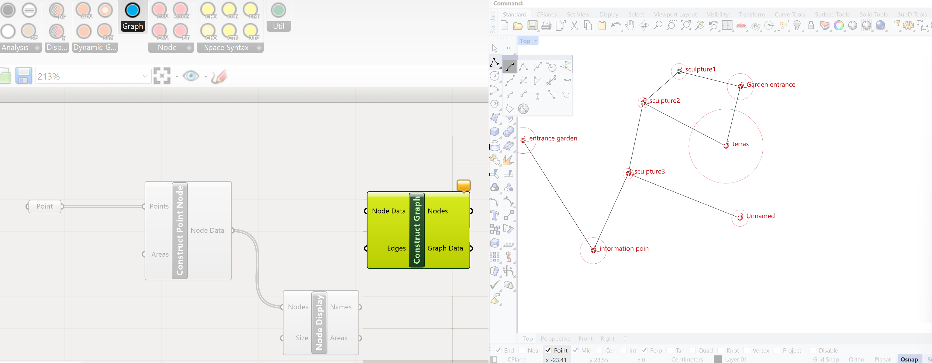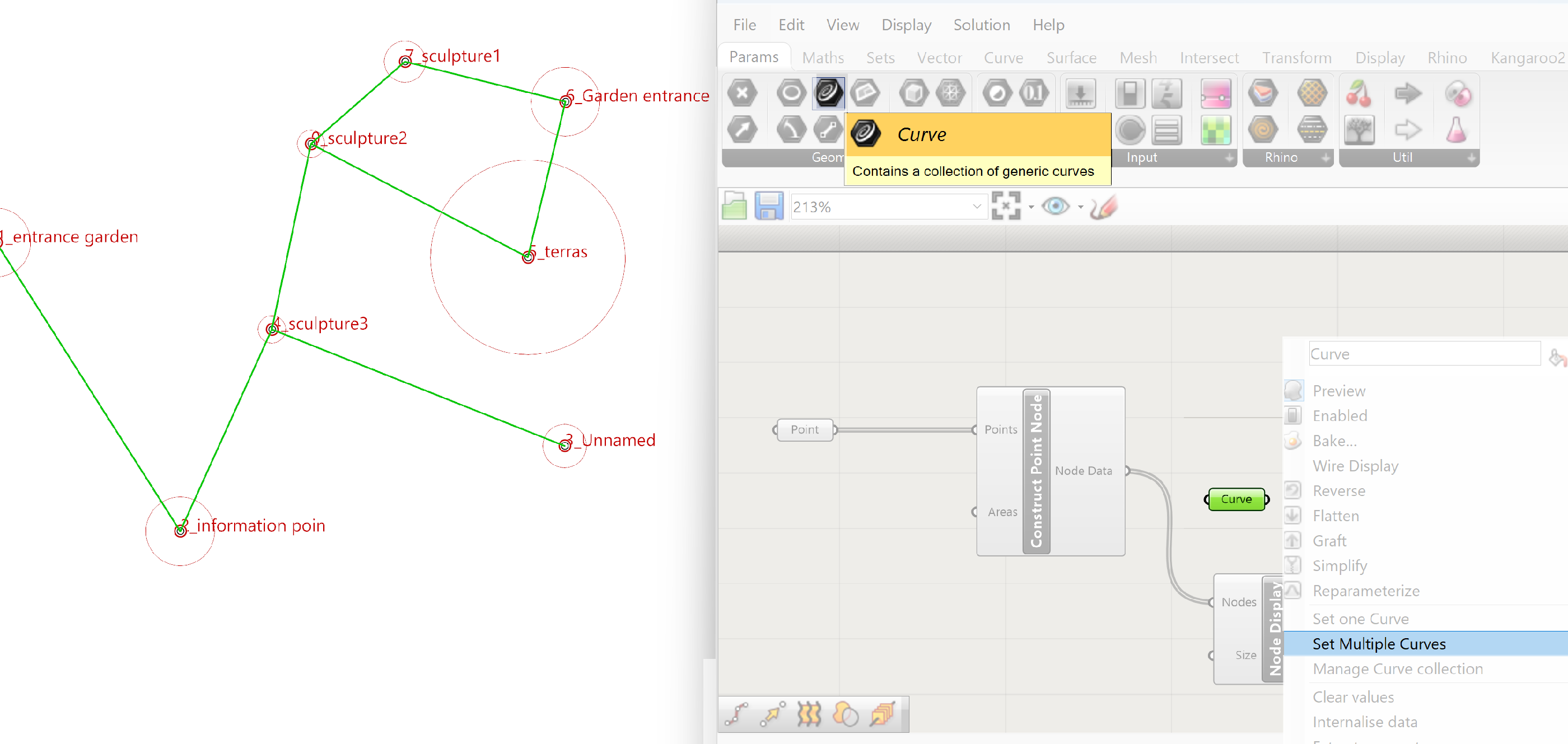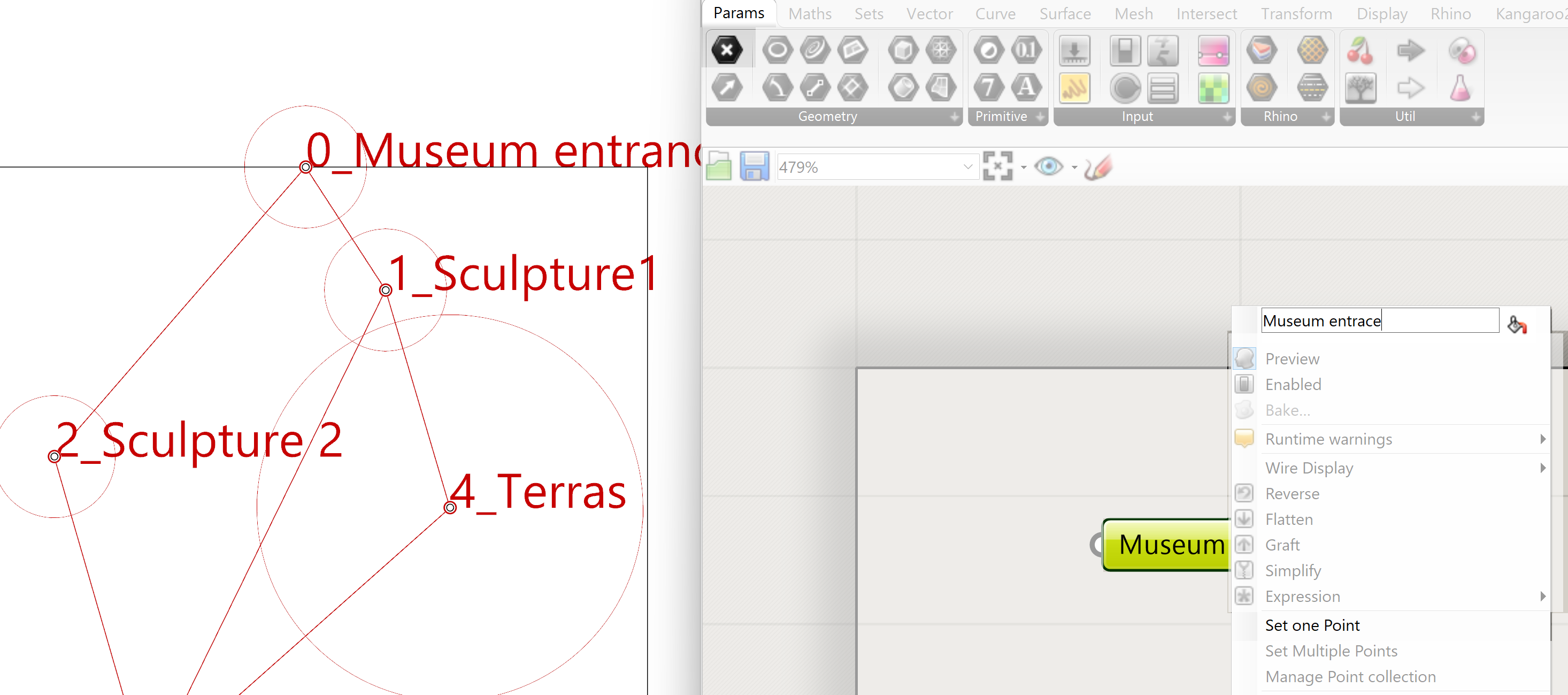 The Construct Point Node component has two inputs. A points input, these are the points we have defined and named in Rhino and an area input. The last one we won’t use because we already have defined the area in the name of the points (Garden entrance* 25)