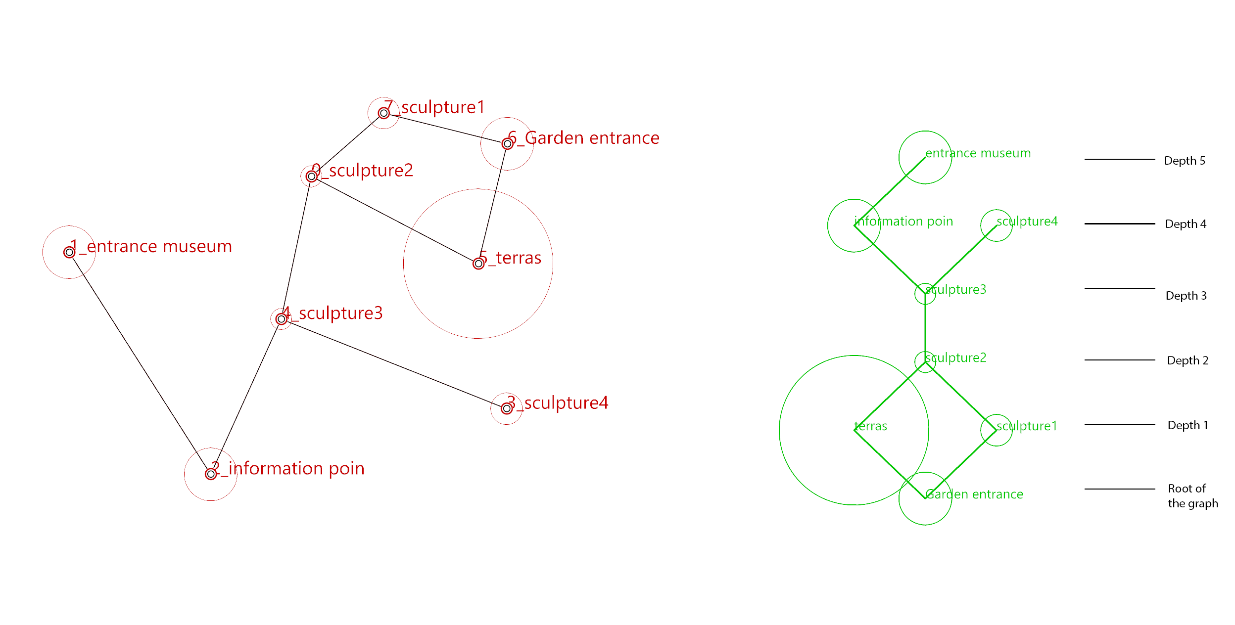 This Graph helps you to analyze the connections between the spaces/functions, giving insight into how the spaces and functions are related to each other, their functional hierarchy and spatial/functional experience when moving from one space/function to another. This graph doesn’t provide the location of the spaces on the site. It defines their spatial/functional relationships, the location of the points of the graph can change location without “breaking” de graph as we can see with the Justified Tree Graph. This analysis provides essential more in-depth insight than a spatial layout on the site alone.