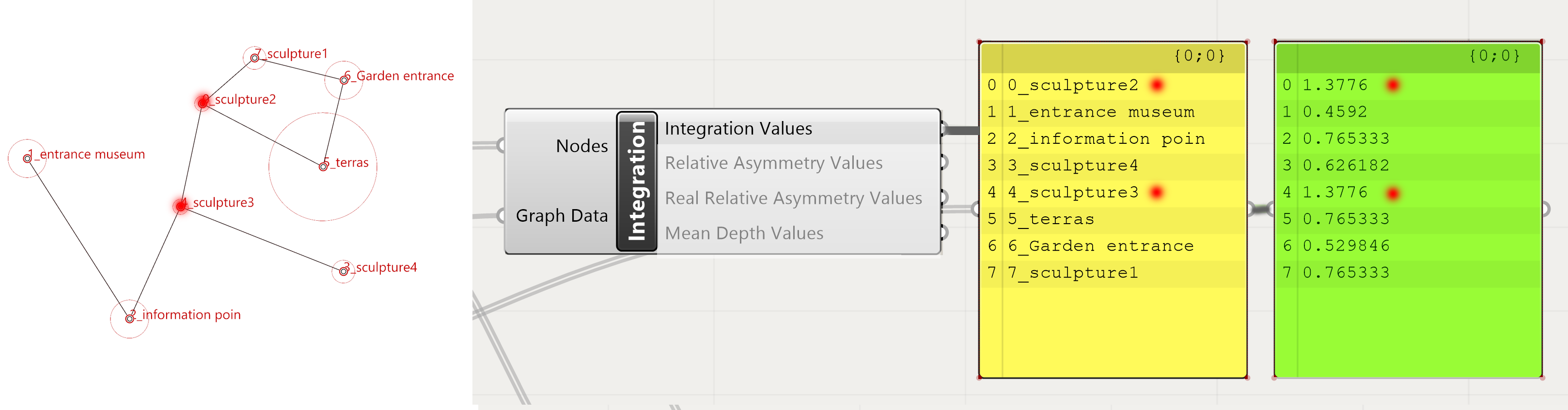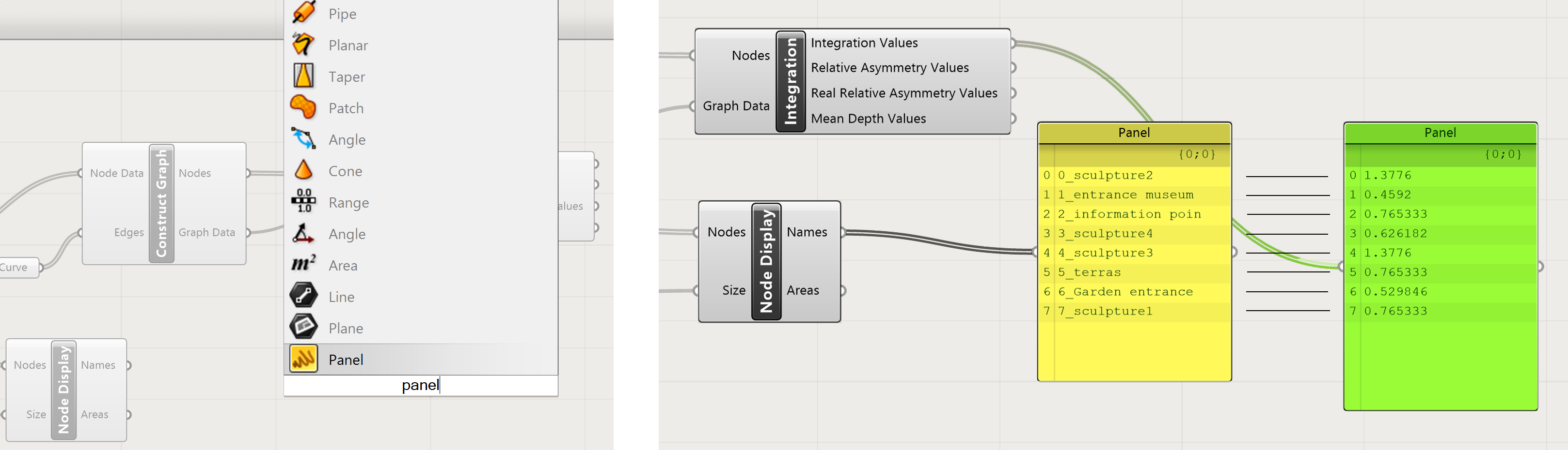 To read the result of the analysis we need a panel. Double click on the canvas and type in panel. This provides a panel which can read the output of the Integration Values. Create another panel to read the names of the points in the graph. The Nodes Display component can be used for this. Connect the names output to the panel and move that panel next to the panel of the Integration values. Now the value can be read from  each of the points of the graph.