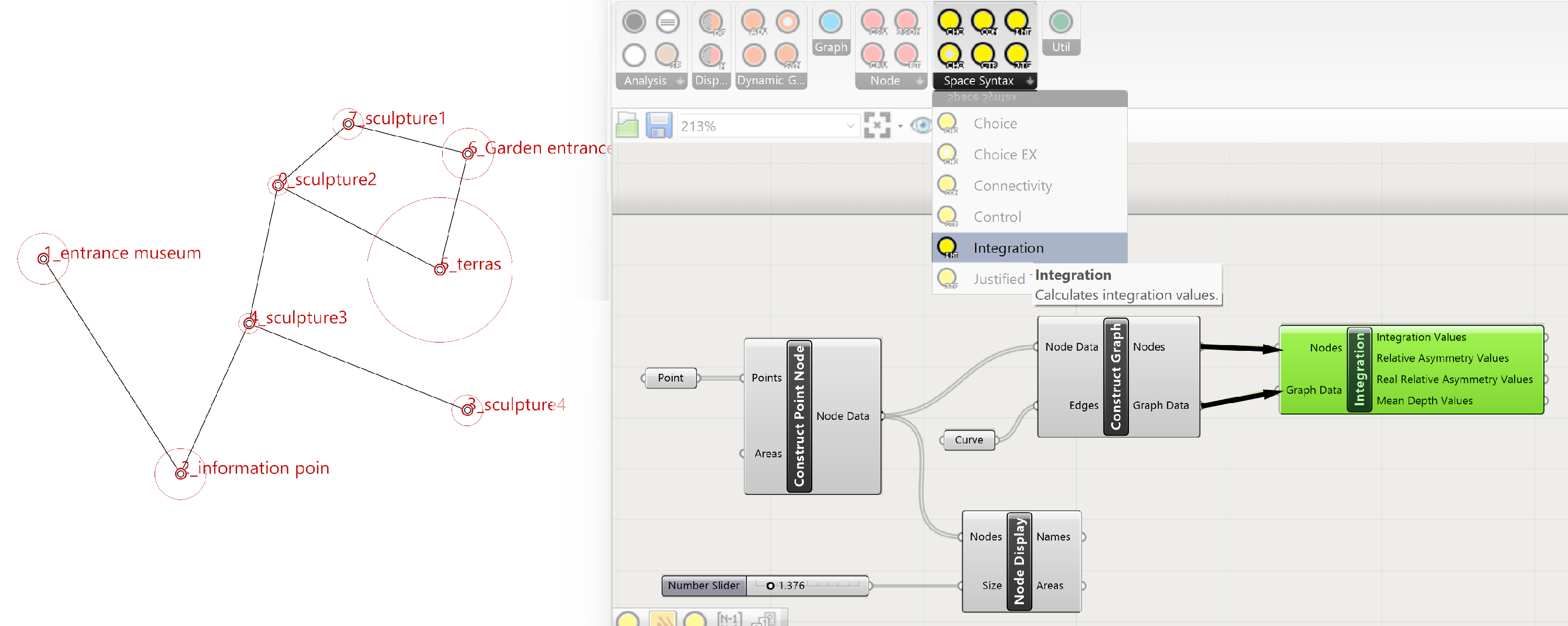 Integration Is an analyses which calculates how close (in this case)  one point in the graph is to all the other points, and provides therefore a measure of relative depth. Due to the calculation of the analysis, the higher the value to more central the point is in relation to the other points. This centrality can be useful for a point with a common function like the information point. Because it is more central is easier to access from the other points.