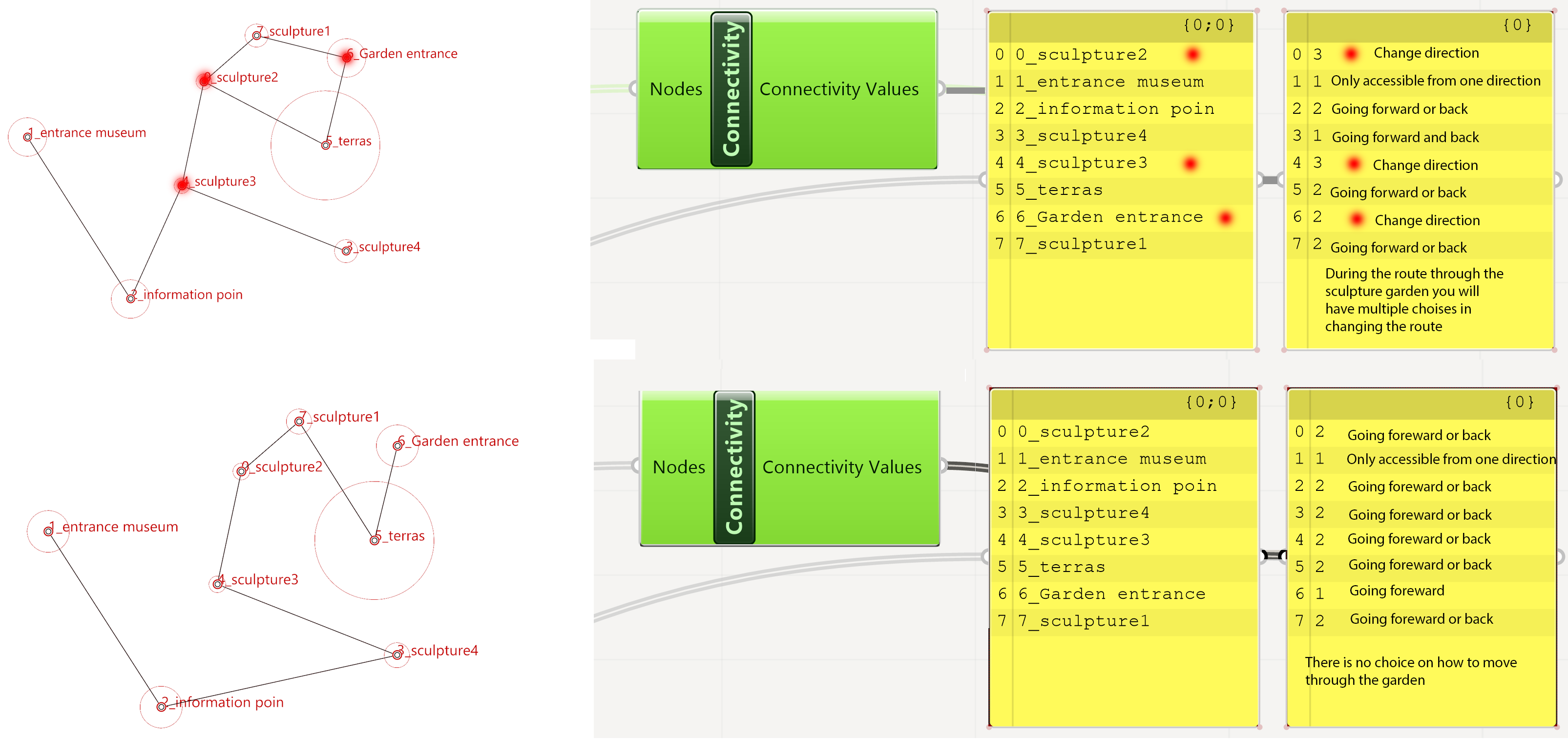 Connectivity investigates the number of direct connections between one point and their directly adjacent points. This tells something about the hierarchy of the points/spaces. Do you want to make all/many of the points directly accessible from one point, say for example the garden entrance, or do you want the visitors to follow a route from one space to another, with maybe some options of changing the route along the way.