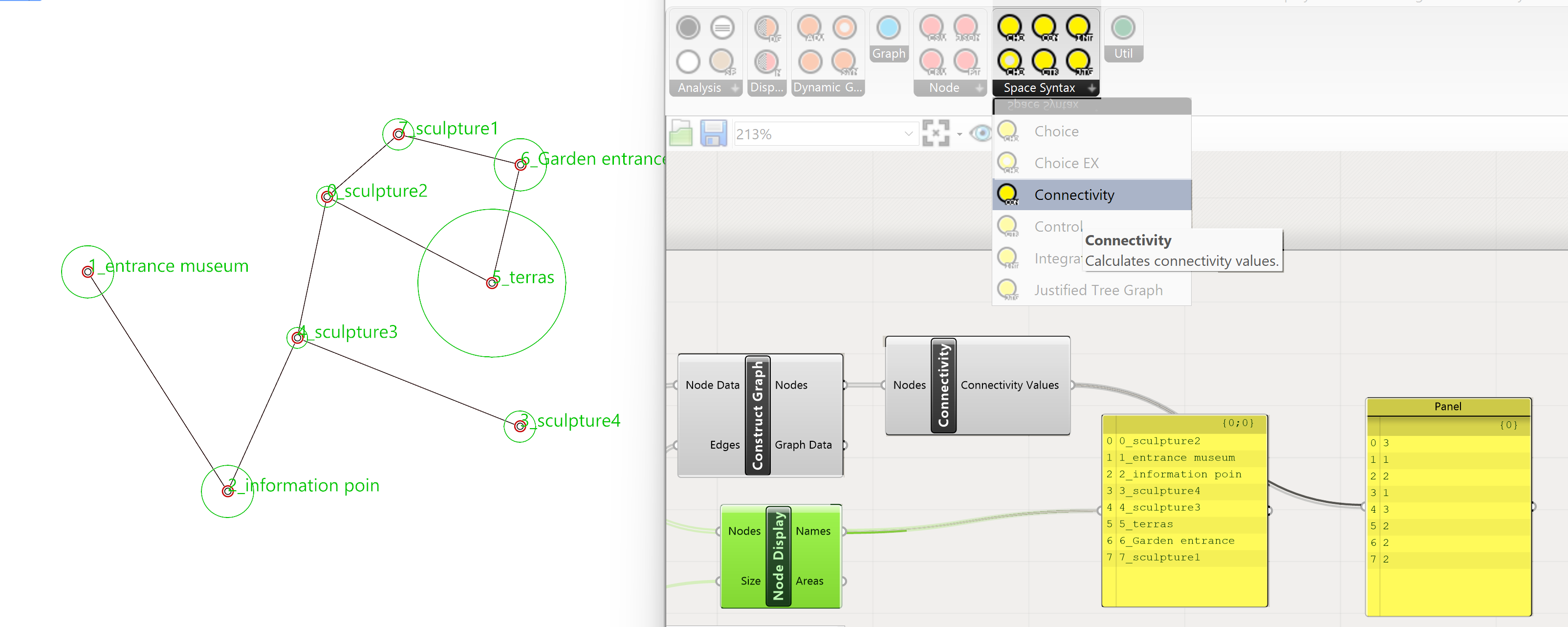 To extract this data from the Graph go to the Space Syntax tab and select Connections. Drag this component onto the canvas. Connect the Nodes output of the Construct Graph component with the Nodes input of the Connectivity component. To access the analysis data connect a panel to the output of the Connectivity component. Make a panel and connect it to the Names output of the Node Display component and place the panels next to each other.
