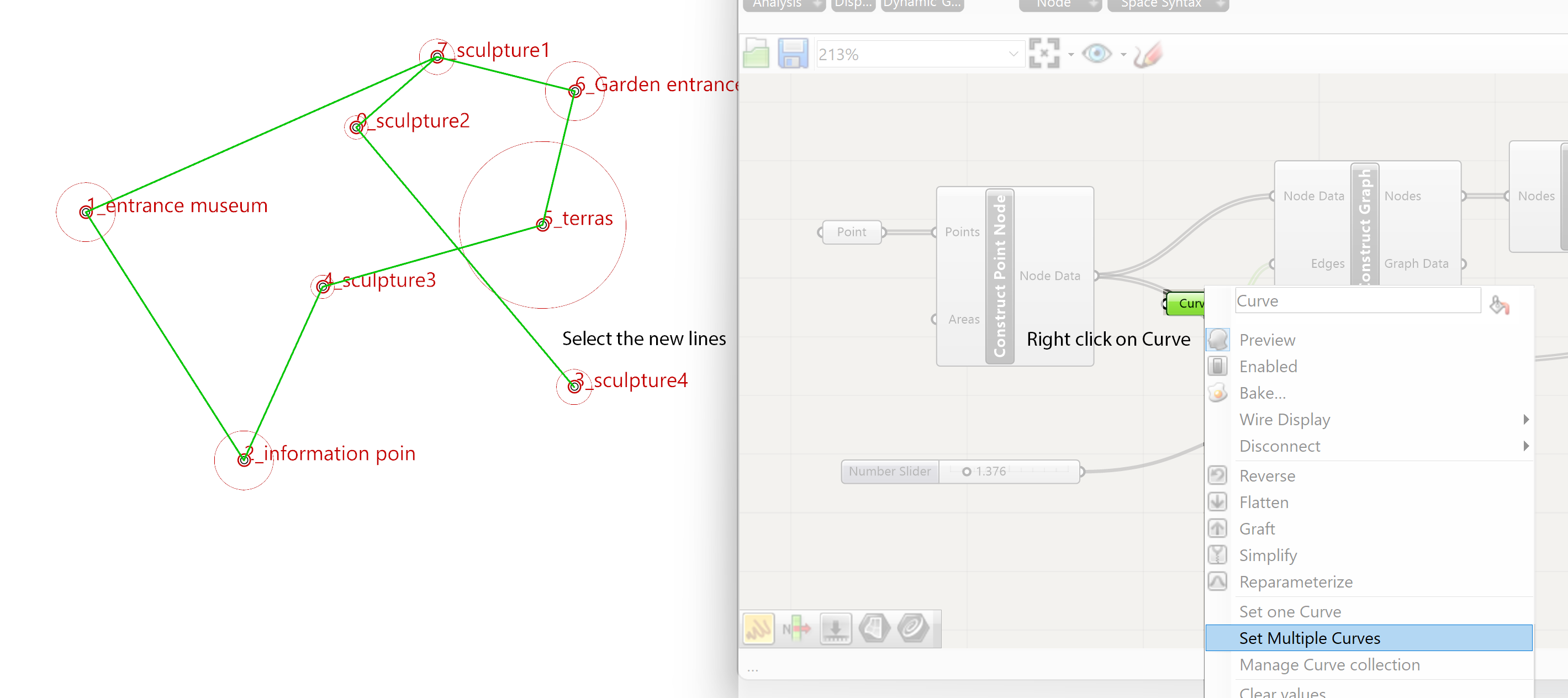 In Grasshopper a Curve parameter is used to import the lines from Rhino into Grasshopper. Select the lines in Rhino and right click on the Curves component, select the Set Multiple Curves option. This Curve parameter is used to the connect to the Edges input of the Construct Graph component.