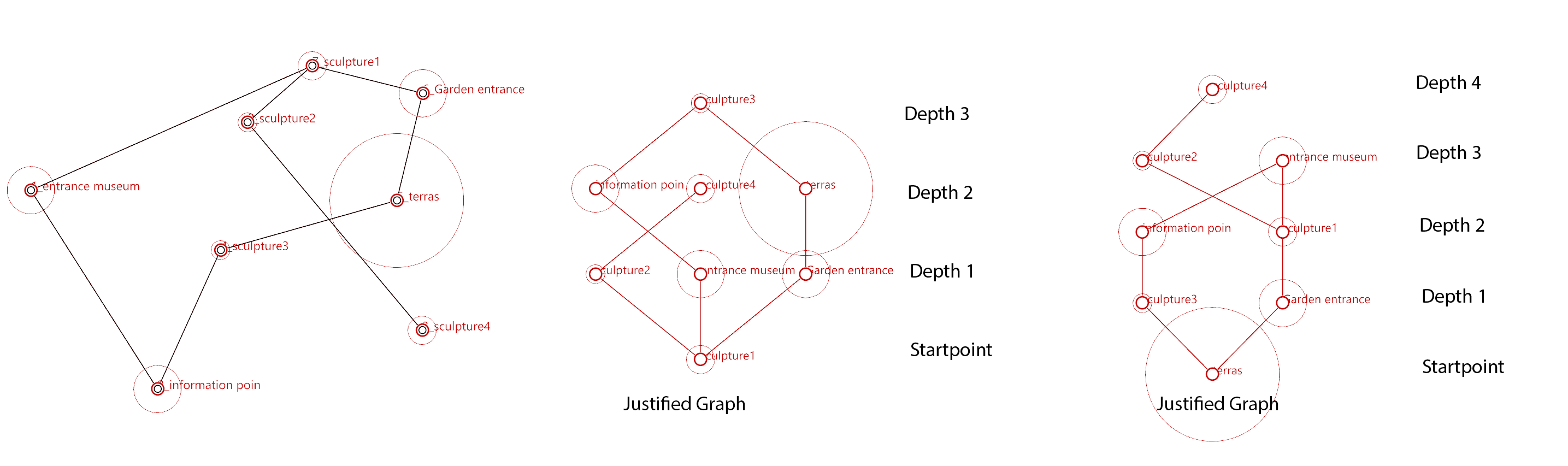 Spacechase has the option to generate a Justified Tree Graph. This means that it can create the graph from the perspective of one point in the graph where it shows how the other points are connected and at what depth they are connected. The network of connections remain the same and therefore the functional connections are the same, although the layout of the points can drastically change.