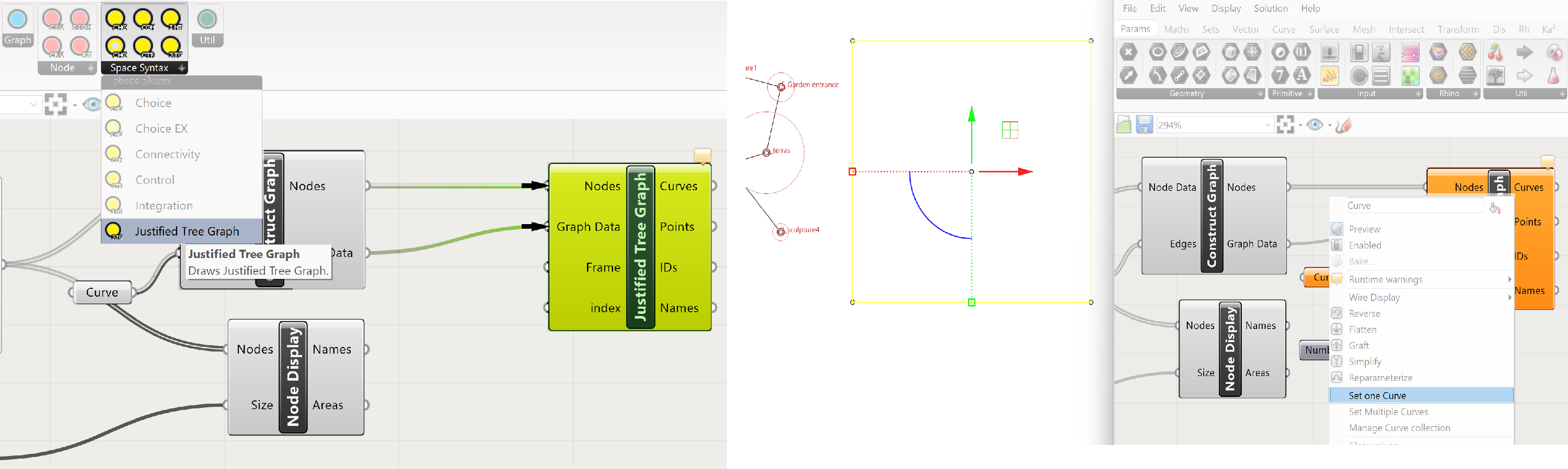 To construct a Justified Tree Graph go to the Spacechase tab and select Justified Tree Graph. Drag this component onto the canvas. We have 4 inputs Nodes, Graph Data, Frame and Index.