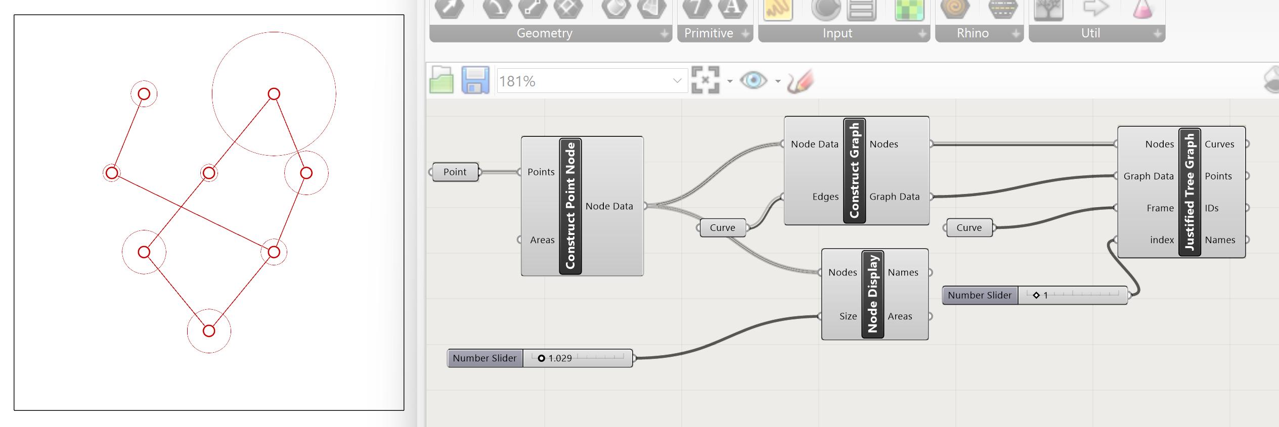 To construct the Graph, the Node Data from the Construct Point Node is connected to the Node Data input of the Construct Graph component. The Curves parameter is connected to the Edges input.