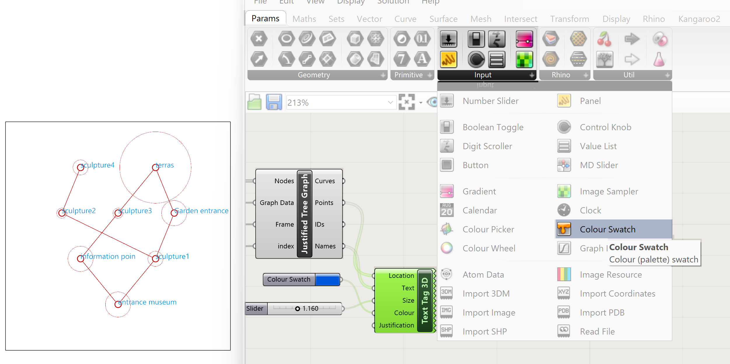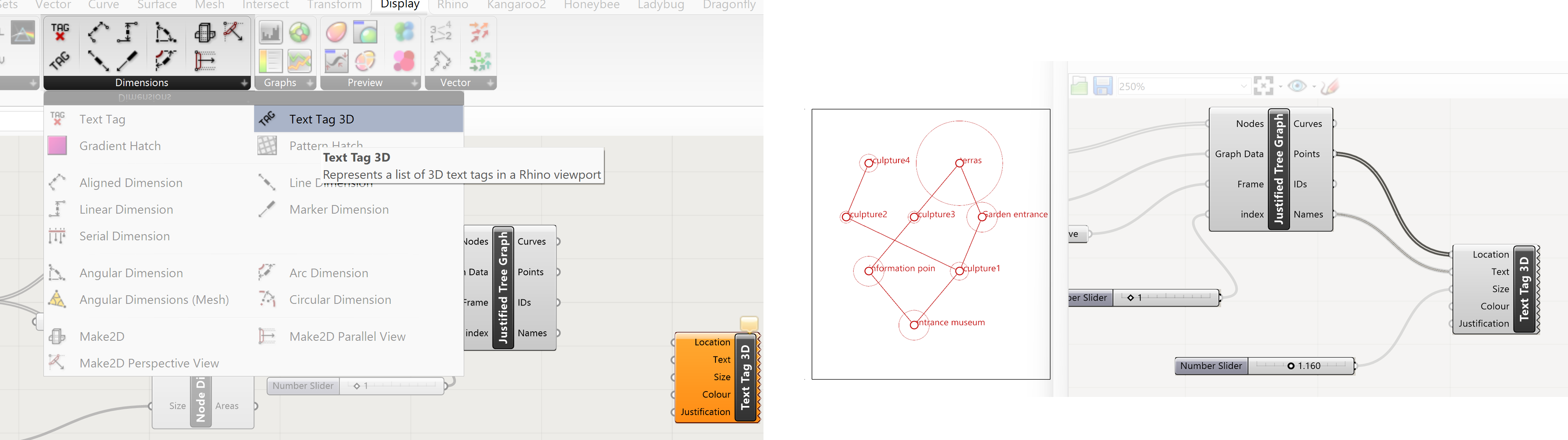 To visualize the names of the points we use a Display – Text Tag 3D component. Select the component and drag it onto the canvas. The input for the Text Tag 3D component is Location ( of the text) , the text ( names of the points ), size ( size of the text ) , color ( of text) and justification ( position of the text next to the point) By right clicking on the Justification input a menu appears where the position of the text in relation to the points can be altered.