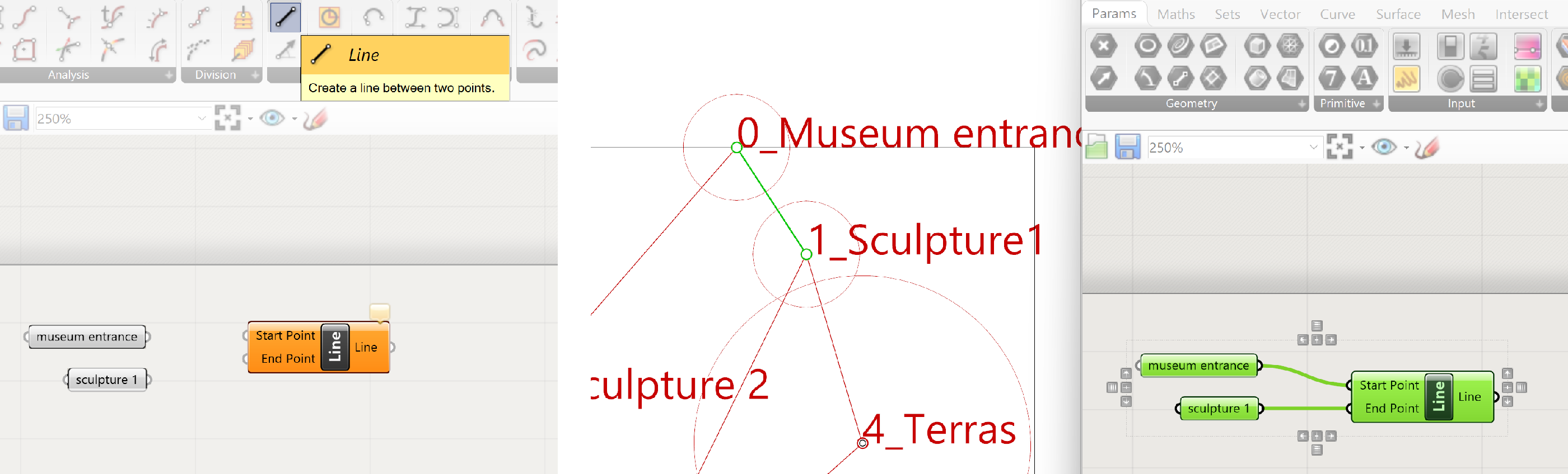 Based on the analysis it might turn out that the connections of the spaces/ functions can be improved. In that case the lines between the points have to be altered and reassigned to Grasshopper.