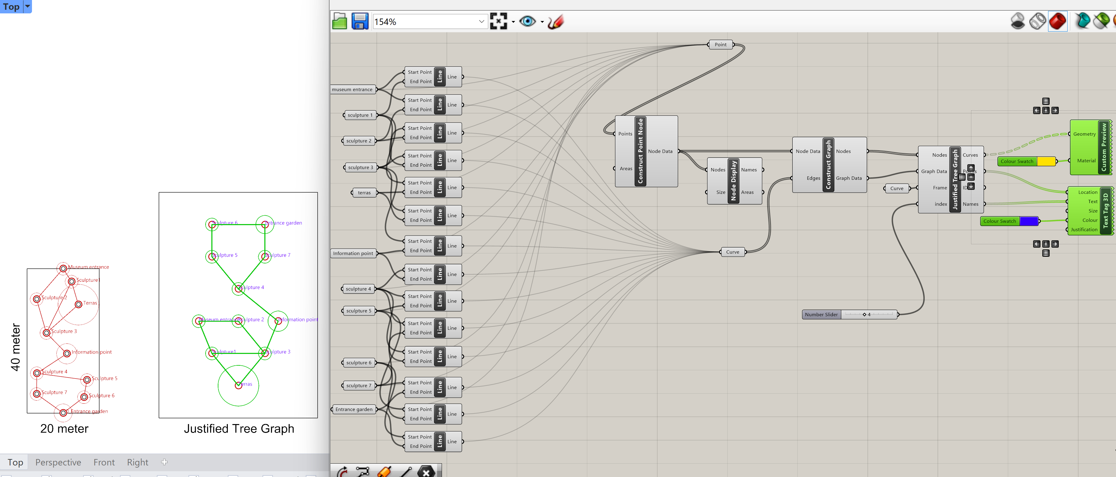 The individual point components will connect to the point input in the Construct Point Node component.  The edges input of the Construct Graph component will be replaced by the new defined curve parameter combining all the separate lines between the points.  The function of the Graph is the same as the Graph using the lines drawn in Rhino, only it is now parametric. That means that if we move a point the lines will remain attached to the point.  In the example file a rectangle of 40 by 20 units is created to give the correct size of the location.