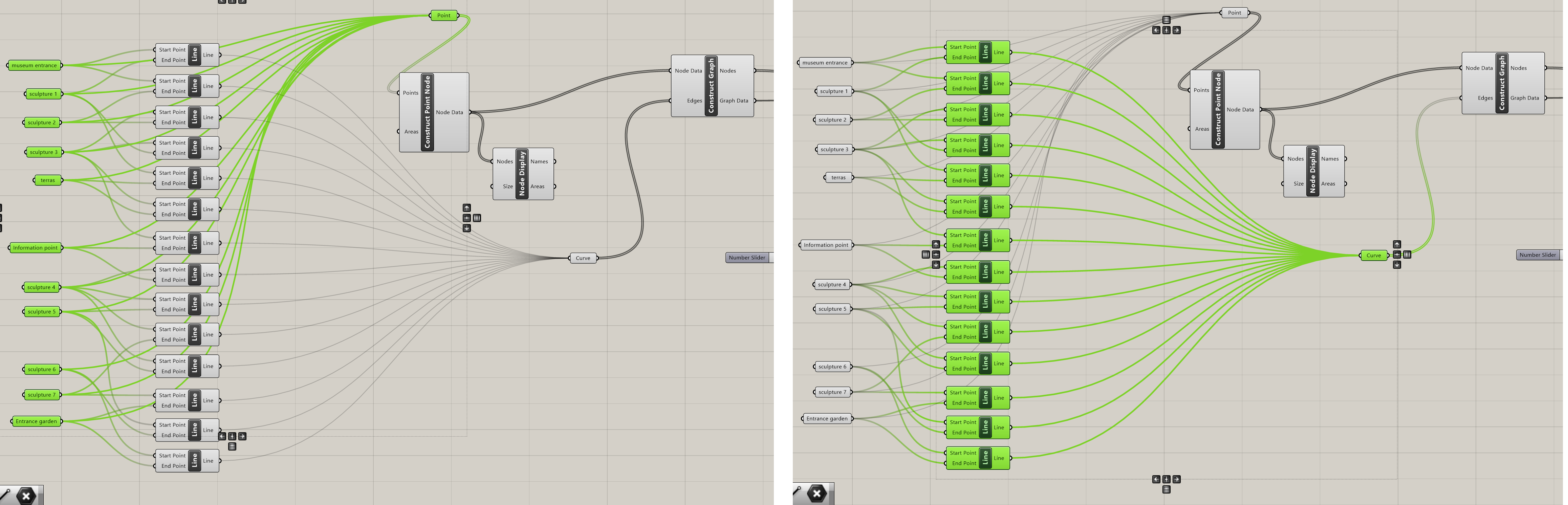 Once the spatial and functional relations are defined, the graph can be used to locate the spaces/functions inside the site. The graph generated in previous text can’t be used for this because the way the graph is imported in Grasshopper. The points and curves between the points are both made in Rhino. The curves are not a result of the points but just drawn. Moving the points will not move the ends of the lines between the points. They will detach.