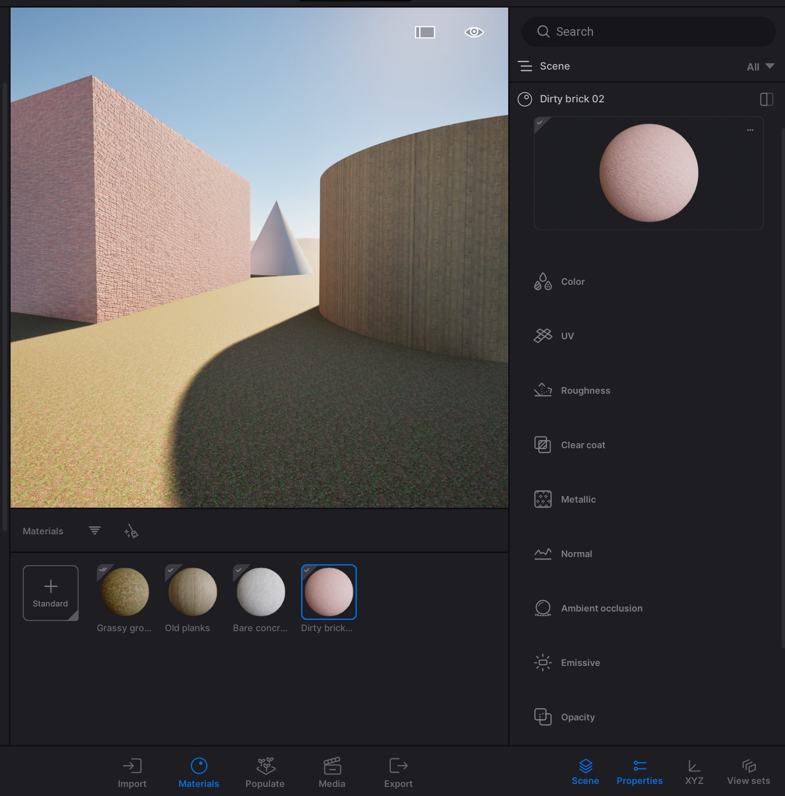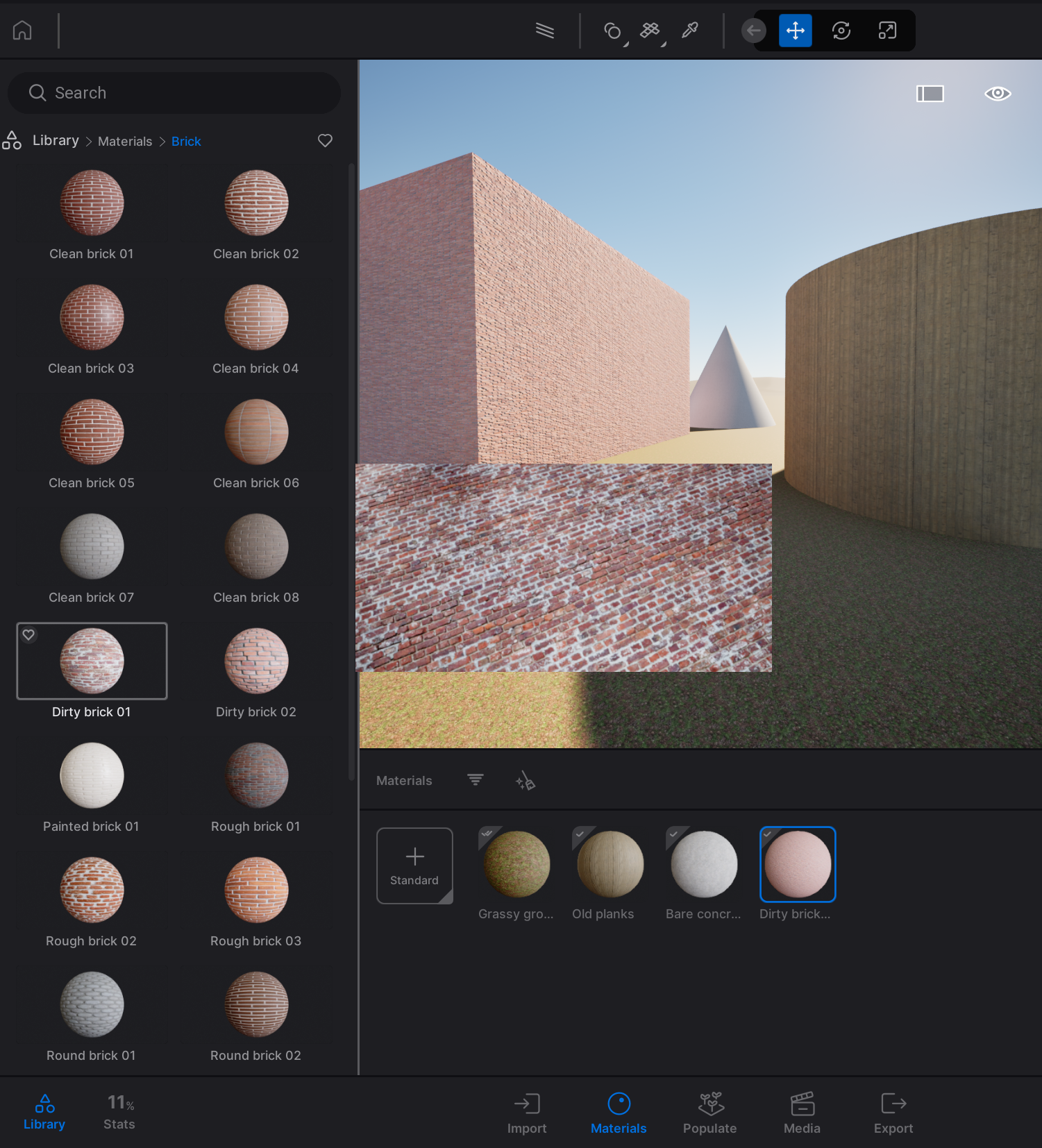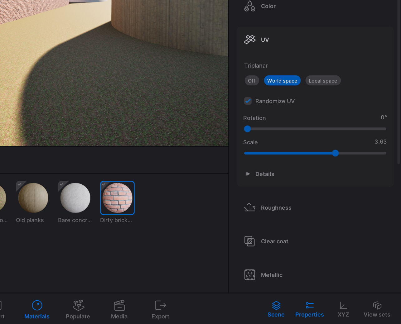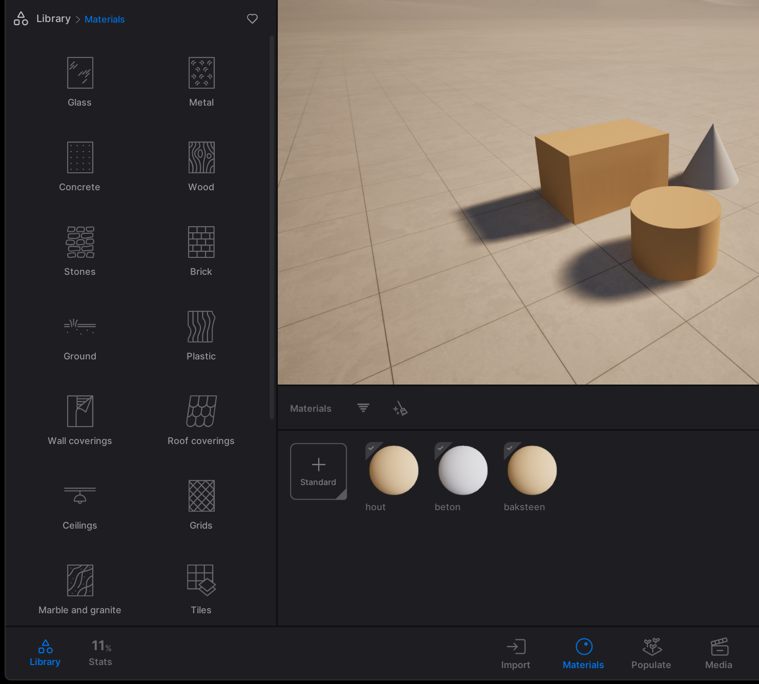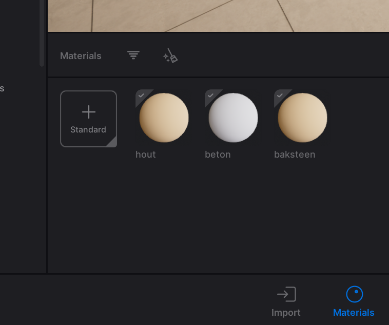 In Twinmotion, navigate to the materials on the bottom of your screen. Here you can find an overview of the material layers you made in Rhino.