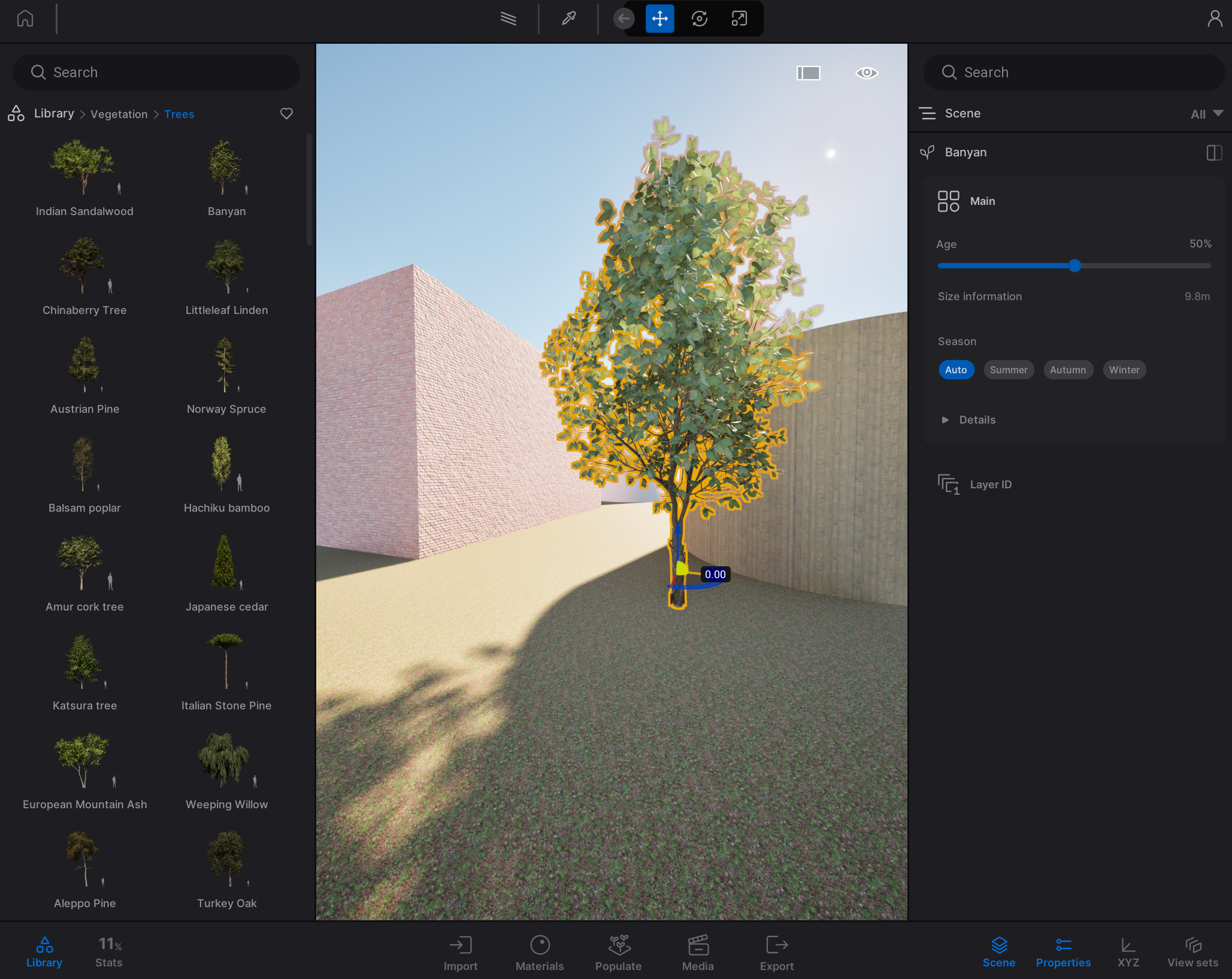 It is possible to change the weather and the season by changing the settings in the “Weather” tab. It is possible to render rain as well as snow. However, the rain particles turn off when the path tracer is turned on.