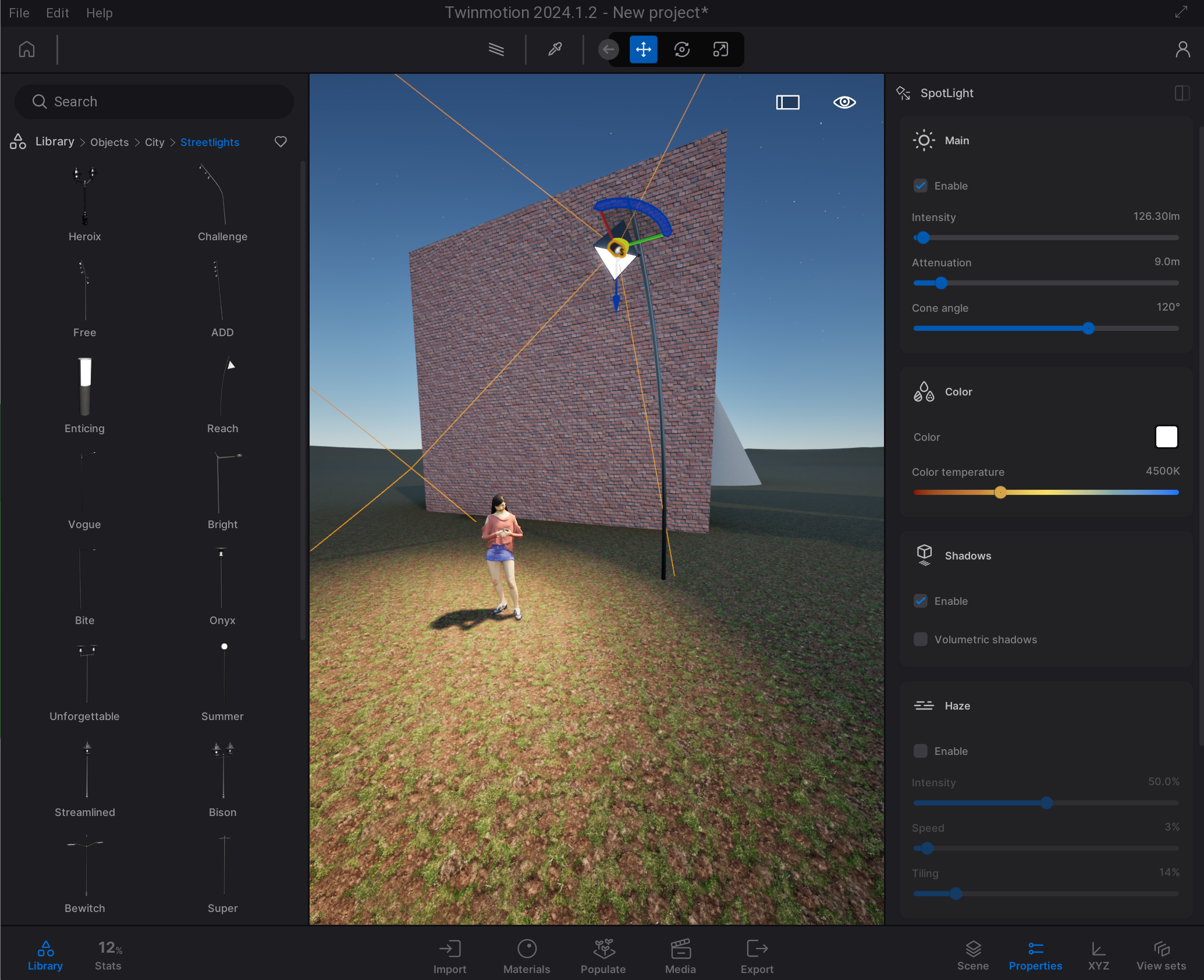 Add light sources to Twinmotion by navigating to the library on the left of your screen and dragging a light source into your scene.