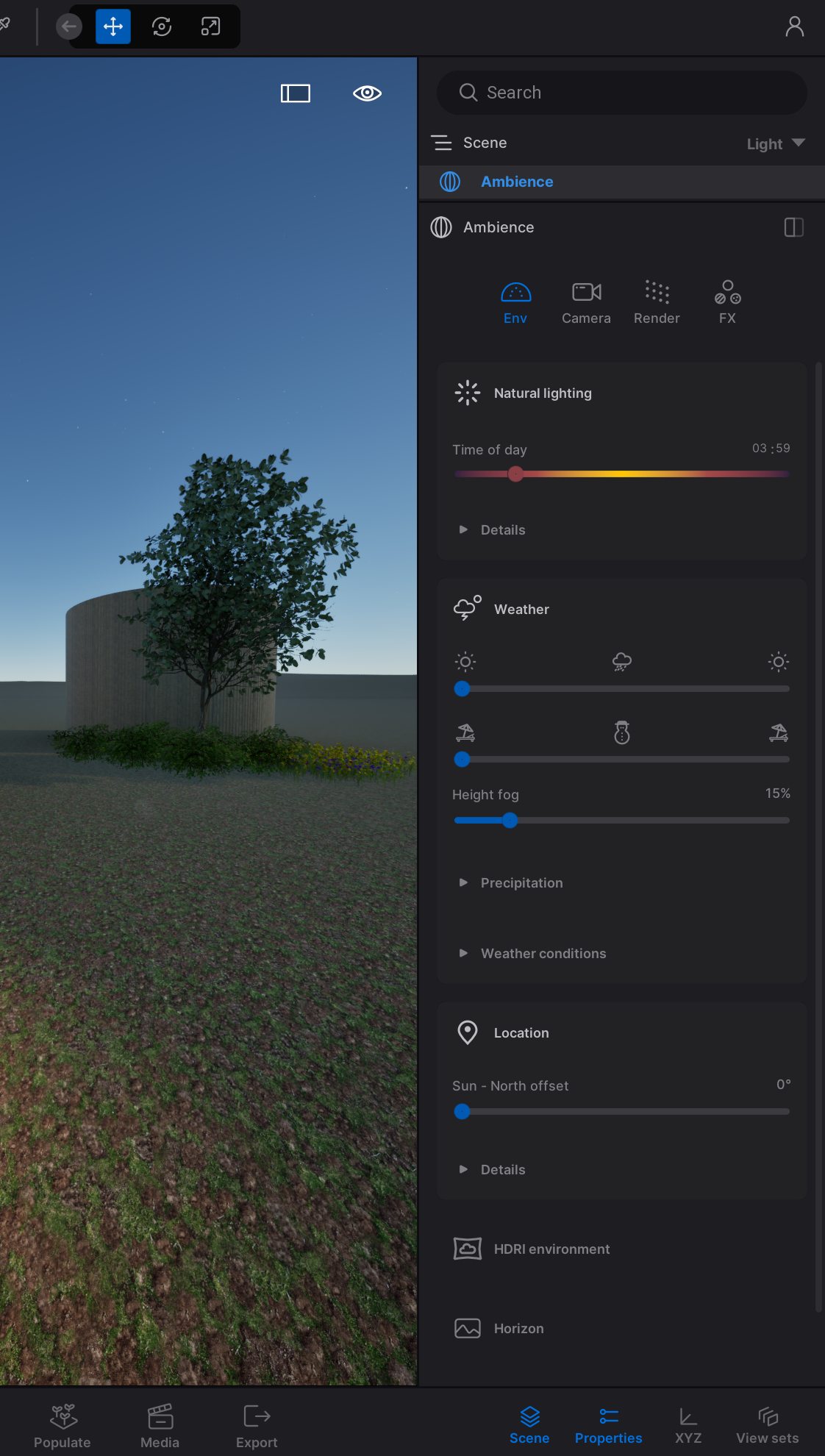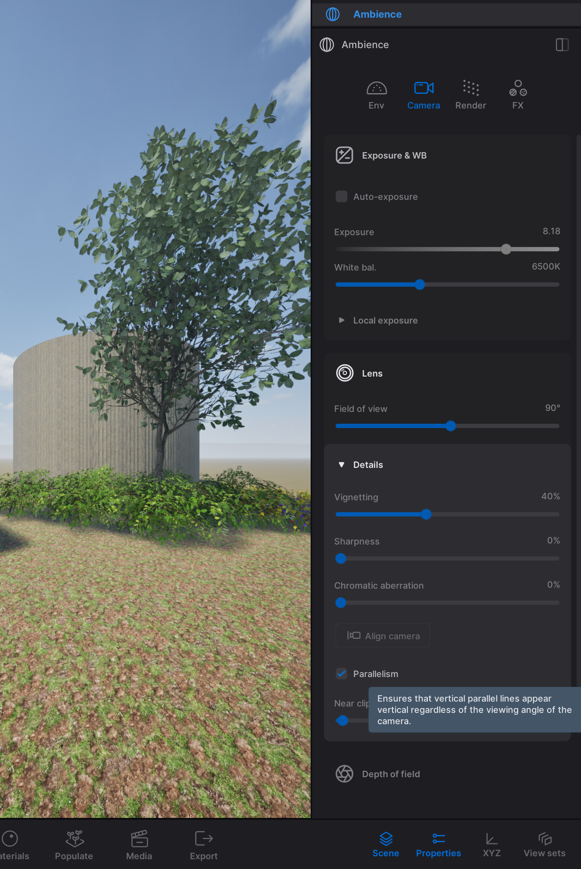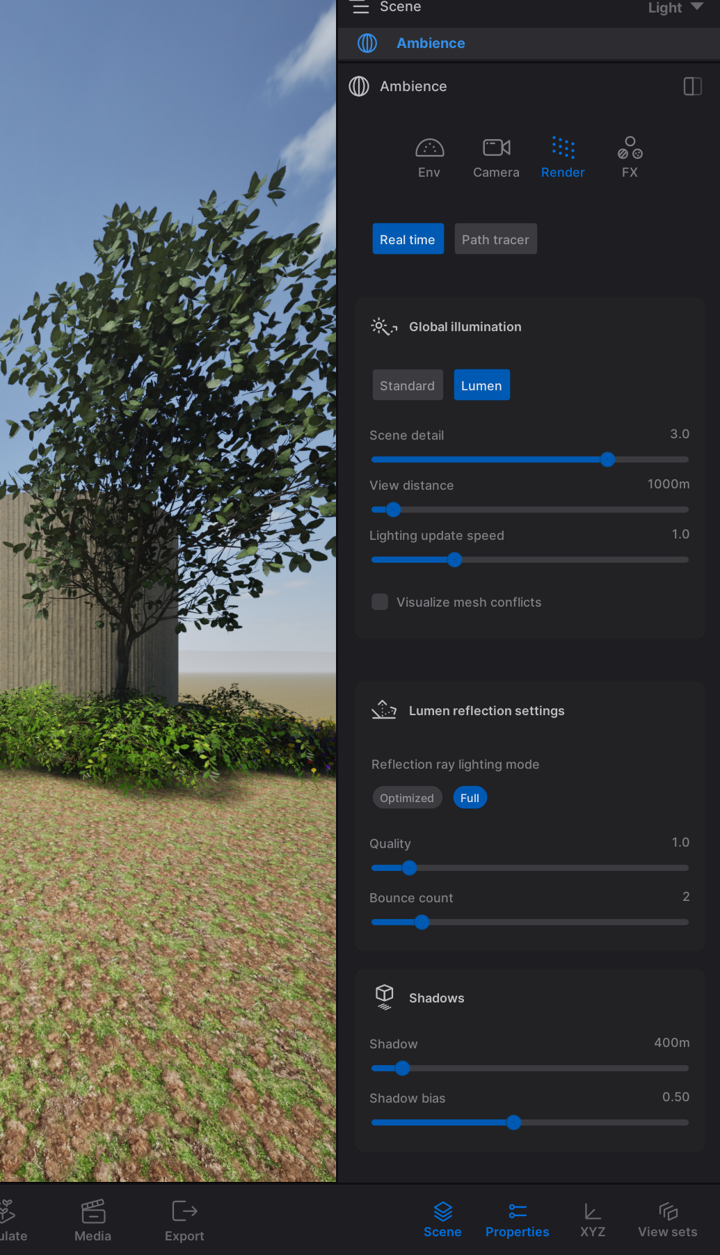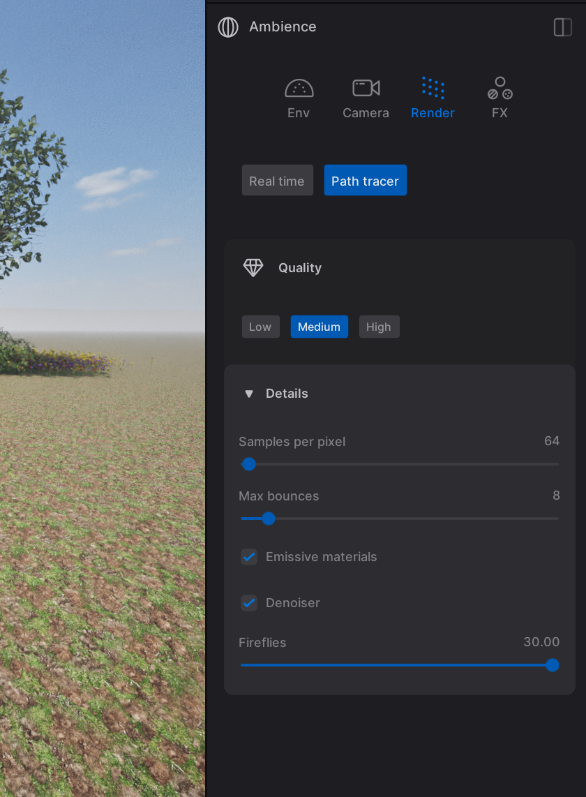 In your scene graph, select “Ambience”. This will open a menu with settings that are related to the environment (lighting, weather, etc.), your camera, render quality and effects. Make sure to play with settings from all tabs at the same time, there is no correct order.