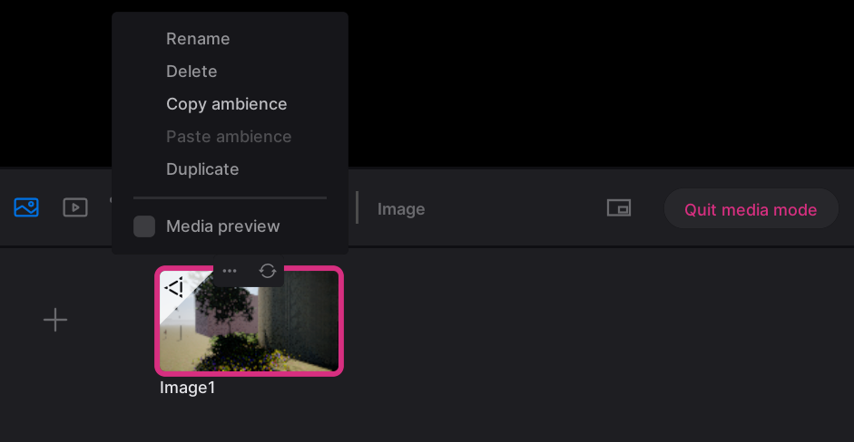 Clicking the + icon will create an image with your current camera potion and ambience settings. If you change the camera position or ambience settings for this image, make sure to click on the “refresh” button that appears when you hover above the image that you’ve created.
