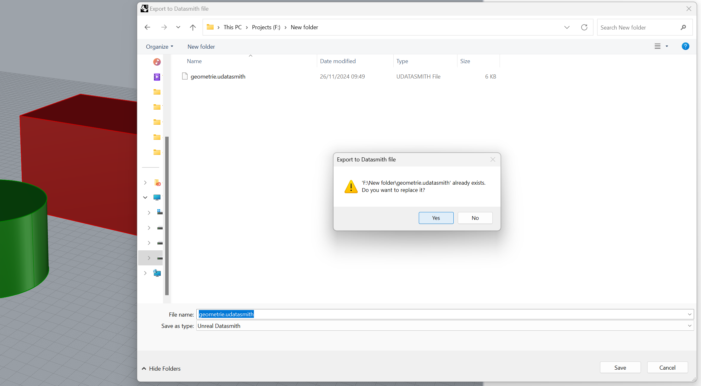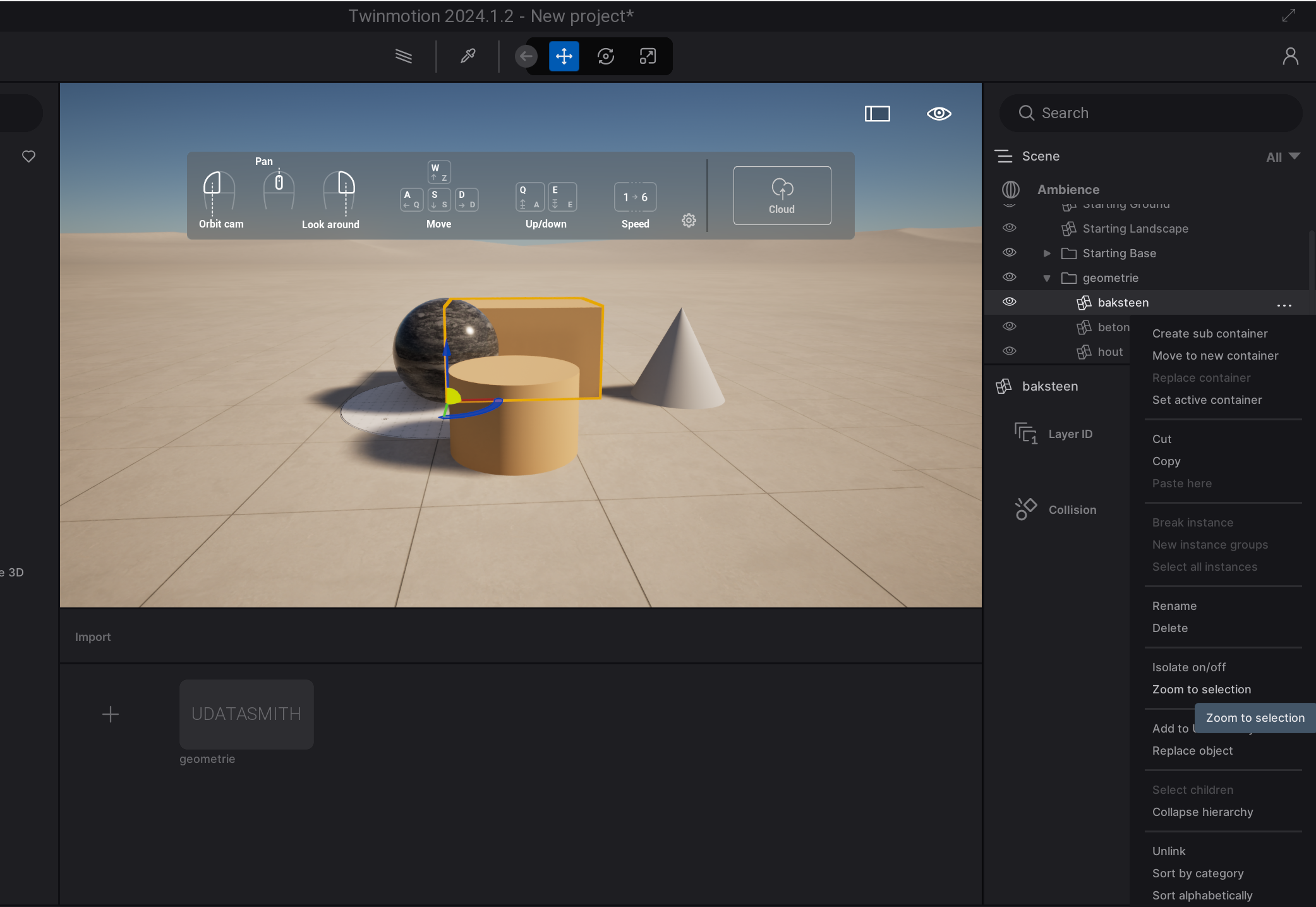 After setting up a Twinmotion file, it is still possible to make changes in the geometry (as long as you correctly followed the previous steps). After changing the geometry in rhino, using the existing layer structure, you can export a .udatasmith file again. It is both possible to overwrite the existing .udatasmith file as well as creating a new one.
